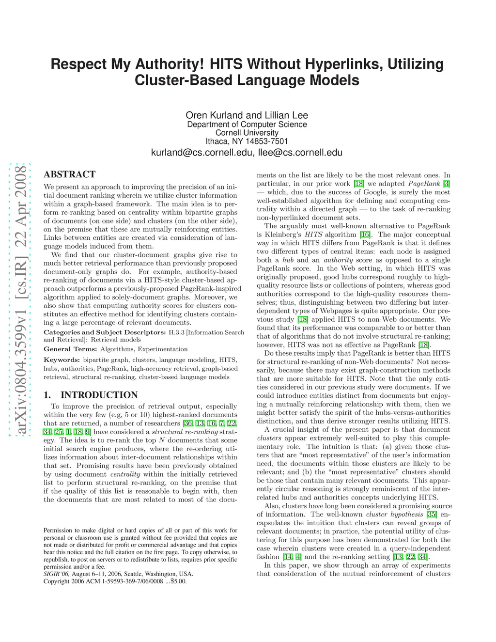 We present an approach to improving the precision of an initial document ranking wherein we utilize cluster information within a graph-based framework. The main idea is to perform re-ranking based on centrality within bipartite graphs of documents (on one side) and clusters (on the other side), on the premise that these are mutually reinforcing entities. Links between entities are created via consideration of language models induced from them. We find that our cluster-document graphs give rise to much better retrieval performance than previously proposed document-only graphs do. For example, authority-based re-ranking of documents via a HITS-style cluster-based approach outperforms a previously-proposed PageRank-inspired algorithm applied to solely-document graphs. Moreover, we also show that computing authority scores for clusters constitutes an effective method for identifying clusters containing a large percentage of relevant documents.
