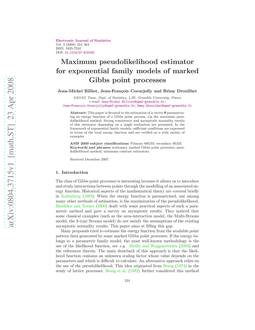 This paper is devoted to the estimation of a vector parametrizing an energy function of a Gibbs point process, via the maximum pseudolikelihood method. Strong consistency and asymptotic normality results of this estimator depending on a single realization are presented. In the framework of exponential family models, sufficient conditions are expressed in terms of the local energy function and are verified on a wide variety of examples.