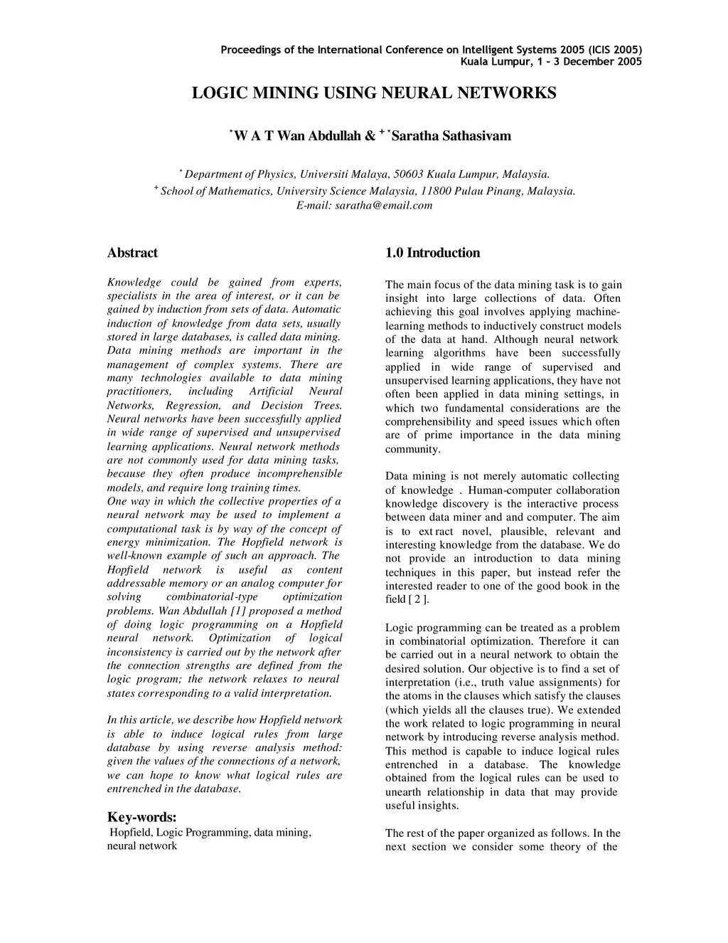 Knowledge could be gained from experts, specialists in the area of interest, or it can be gained by induction from sets of data. Automatic induction of knowledge from data sets, usually stored in large databases, is called data mining. Data mining methods are important in the management of complex systems. There are many technologies available to data mining practitioners, including Artificial Neural Networks, Regression, and Decision Trees. Neural networks have been successfully applied in wide range of supervised and unsupervised learning applications. Neural network methods are not commonly used for data mining tasks, because they often produce incomprehensible models, and require long training times. One way in which the collective properties of a neural network may be used to implement a computational task is by way of the concept of energy minimization. The Hopfield network is well-known example of such an approach. The Hopfield network is useful as content addressable memory or an analog computer for solving combinatorial-type optimization problems. Wan Abdullah [1] proposed a method of doing logic programming on a Hopfield neural network. Optimization of logical inconsistency is carried out by the network after the connection strengths are defined from the logic program; the network relaxes to neural states corresponding to a valid interpretation. In this article, we describe how Hopfield network is able to induce logical rules from large database by using reverse analysis method: given the values of the connections of a network, we can hope to know what logical rules are entrenched in the database.