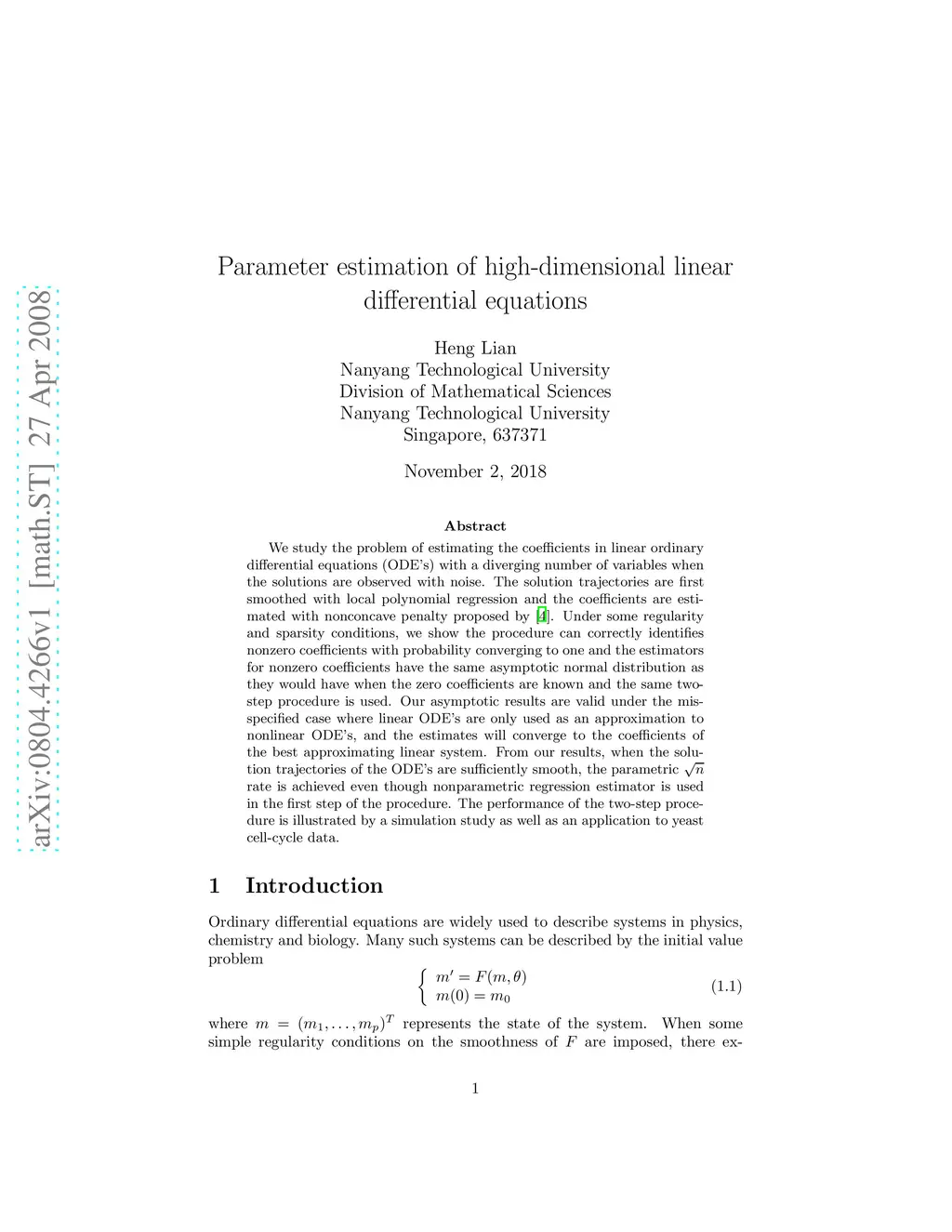 We study the problem of estimating the coefficients in linear ordinary differential equations (ODE's) with a diverging number of variables when the solutions are observed with noise. The solution trajectories are first smoothed with local polynomial regression and the coefficients are estimated with nonconcave penalty proposed by \cite{fan01}. Under some regularity and sparsity conditions, we show the procedure can correctly identifies nonzero coefficients with probability converging to one and the estimators for nonzero coefficients have the same asymptotic normal distribution as they would have when the zero coefficients are known and the same two-step procedure is used. Our asymptotic results are valid under the misspecified case where linear ODE's are only used as an approximation to nonlinear ODE's, and the estimates will converge to the coefficients of the best approximating linear system. From our results, when the solution trajectories of the ODE's are sufficiently smooth, the parametric rate is achieved even though nonparametric regression estimator is used in the first step of the procedure. The performance of the two-step procedure is illustrated by a simulation study as well as an application to yeast cell-cycle data.
