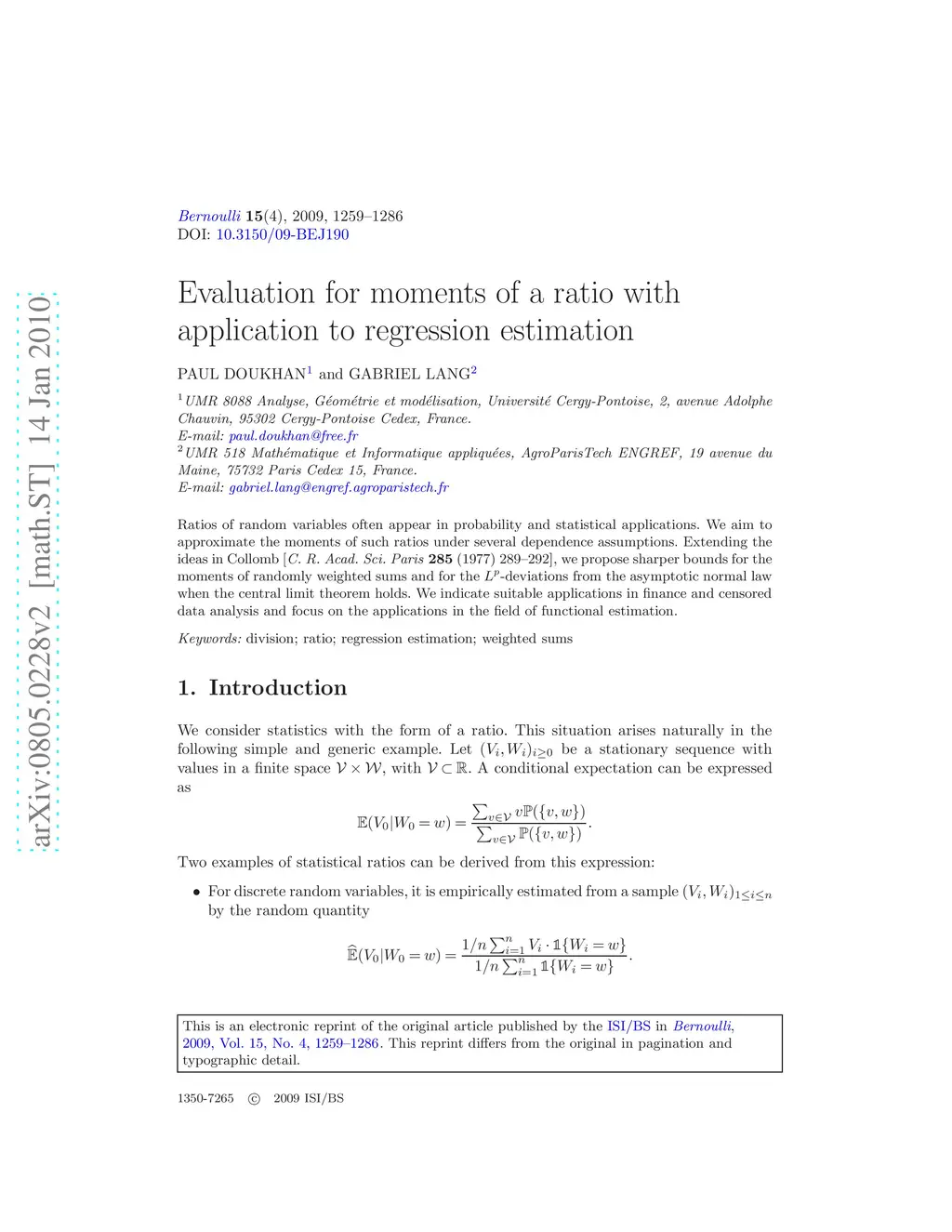 Ratios of random variables often appear in probability and statistical applications. We aim to approximate the moments of such ratios under several dependence assumptions. Extending the ideas in Collomb [C. R. Acad. Sci. Paris 285 (1977) 289--292], we propose sharper bounds for the moments of randomly weighted sums and for the -deviations from the asymptotic normal law when the central limit theorem holds. We indicate suitable applications in finance and censored data analysis and focus on the applications in the field of functional estimation.