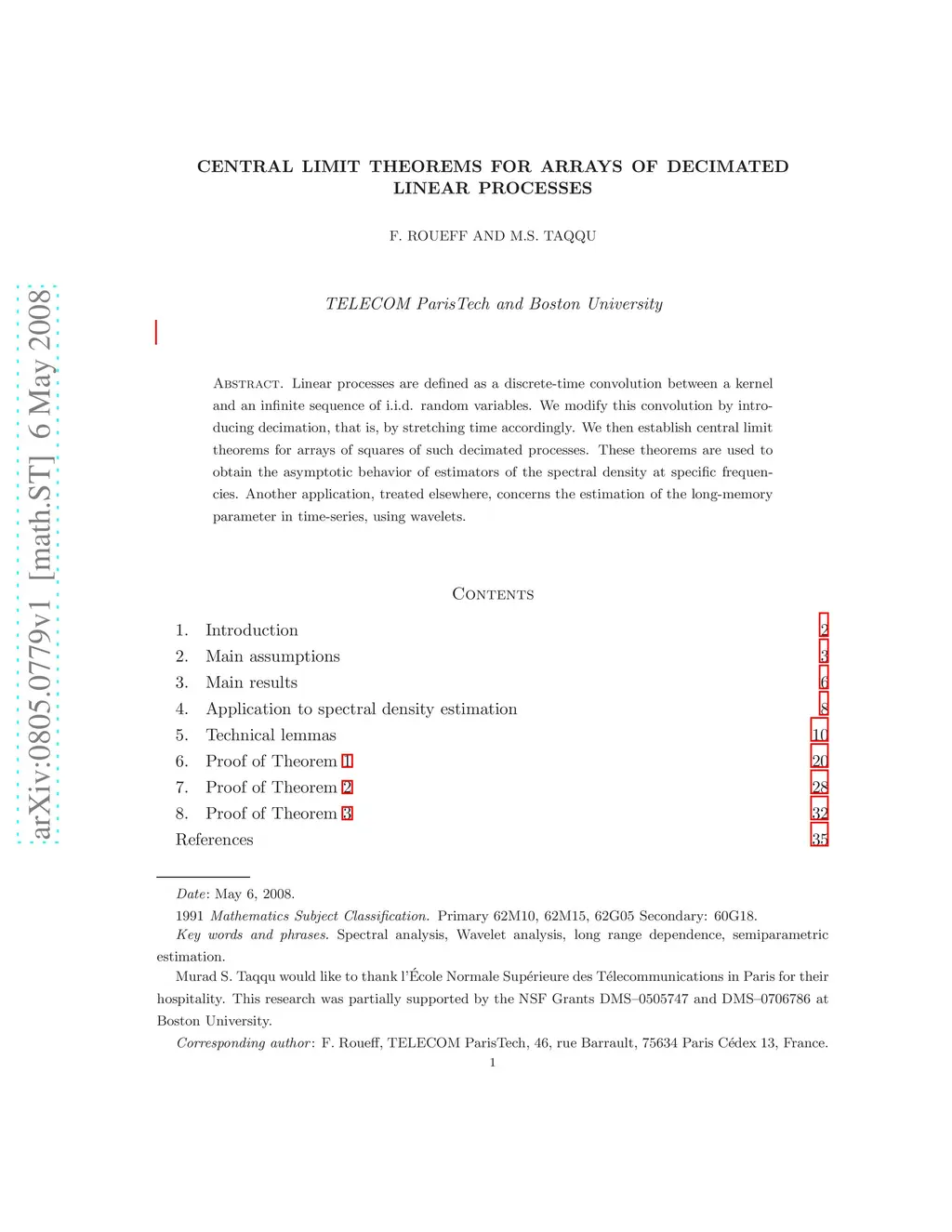 Linear processes are defined as a discrete-time convolution between a kernel and an infinite sequence of i.i.d. random variables. We modify this convolution by introducing decimation, that is, by stretching time accordingly. We then establish central limit theorems for arrays of squares of such decimated processes. These theorems are used to obtain the asymptotic behavior of estimators of the spectral density at specific frequencies. Another application, treated elsewhere, concerns the estimation of the long-memory parameter in time-series, using wavelets.