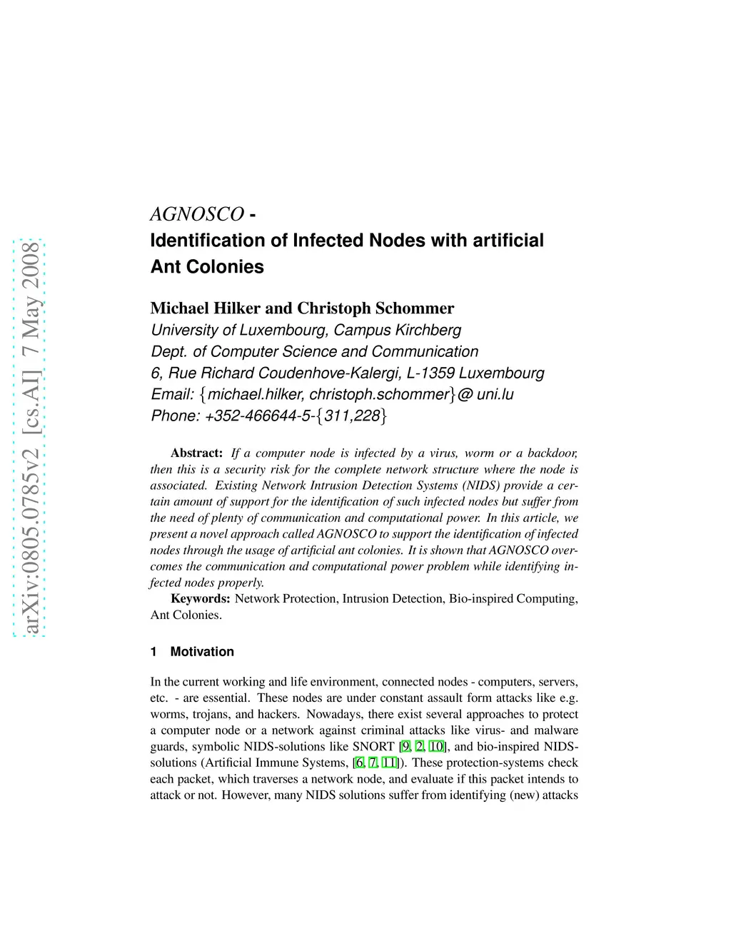 If a computer node is infected by a virus, worm or a backdoor, then this is a security risk for the complete network structure where the node is associated. Existing Network Intrusion Detection Systems (NIDS) provide a certain amount of support for the identification of such infected nodes but suffer from the need of plenty of communication and computational power. In this article, we present a novel approach called AGNOSCO to support the identification of infected nodes through the usage of artificial ant colonies. It is shown that AGNOSCO overcomes the communication and computational power problem while identifying infected nodes properly.