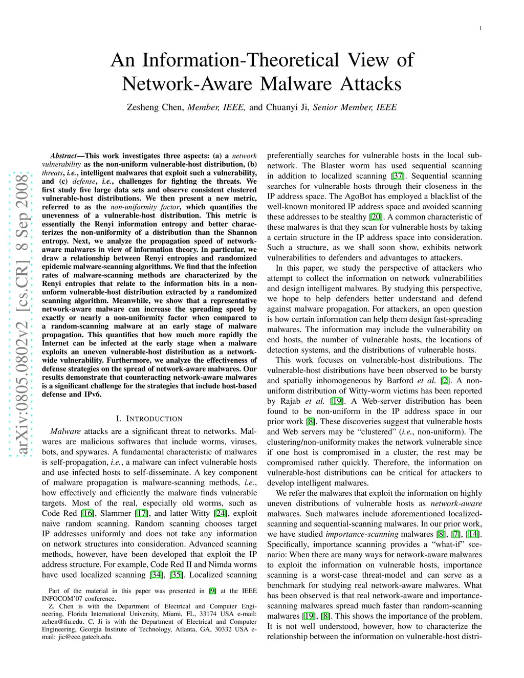 This work investigates three aspects: (a) a network vulnerability as the non-uniform vulnerable-host distribution, (b) threats, i.e., intelligent malwares that exploit such a vulnerability, and (c) defense, i.e., challenges for fighting the threats. We first study five large data sets and observe consistent clustered vulnerable-host distributions. We then present a new metric, referred to as the non-uniformity factor, which quantifies the unevenness of a vulnerable-host distribution. This metric is essentially the Renyi information entropy and better characterizes the non-uniformity of a distribution than the Shannon entropy. Next, we analyze the propagation speed of network-aware malwares in view of information theory. In particular, we draw a relationship between Renyi entropies and randomized epidemic malware-scanning algorithms. We find that the infection rates of malware-scanning methods are characterized by the Renyi entropies that relate to the information bits in a non-unform vulnerable-host distribution extracted by a randomized scanning algorithm. Meanwhile, we show that a representative network-aware malware can increase the spreading speed by exactly or nearly a non-uniformity factor when compared to a random-scanning malware at an early stage of malware propagation. This quantifies that how much more rapidly the Internet can be infected at the early stage when a malware exploits an uneven vulnerable-host distribution as a network-wide vulnerability. Furthermore, we analyze the effectiveness of defense strategies on the spread of network-aware malwares. Our results demonstrate that counteracting network-aware malwares is a significant challenge for the strategies that include host-based defense and IPv6.