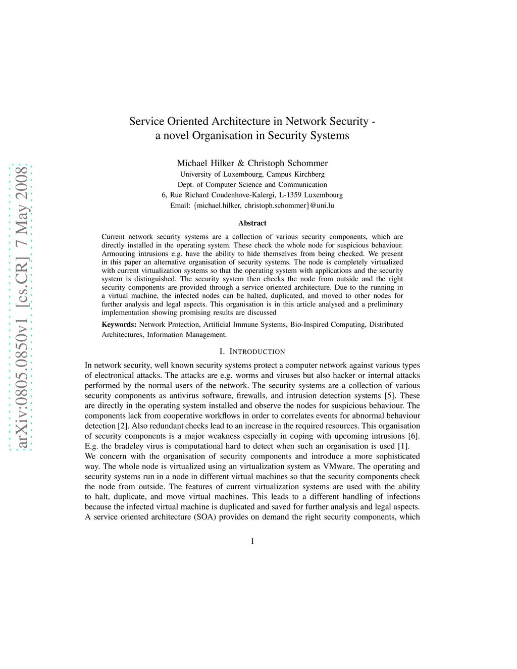 Current network security systems are a collection of various security components, which are directly installed in the operating system. These check the whole node for suspicious behaviour. Armouring intrusions e.g. have the ability to hide themselves from being checked. We present in this paper an alternative organisation of security systems. The node is completely virtualized with current virtualization systems so that the operating system with applications and the security system is distinguished. The security system then checks the node from outside and the right security components are provided through a service oriented architecture. Due to the running in a virtual machine, the infected nodes can be halted, duplicated, and moved to other nodes for further analysis and legal aspects. This organisation is in this article analysed and a preliminary implementation showing promising results are discussed.