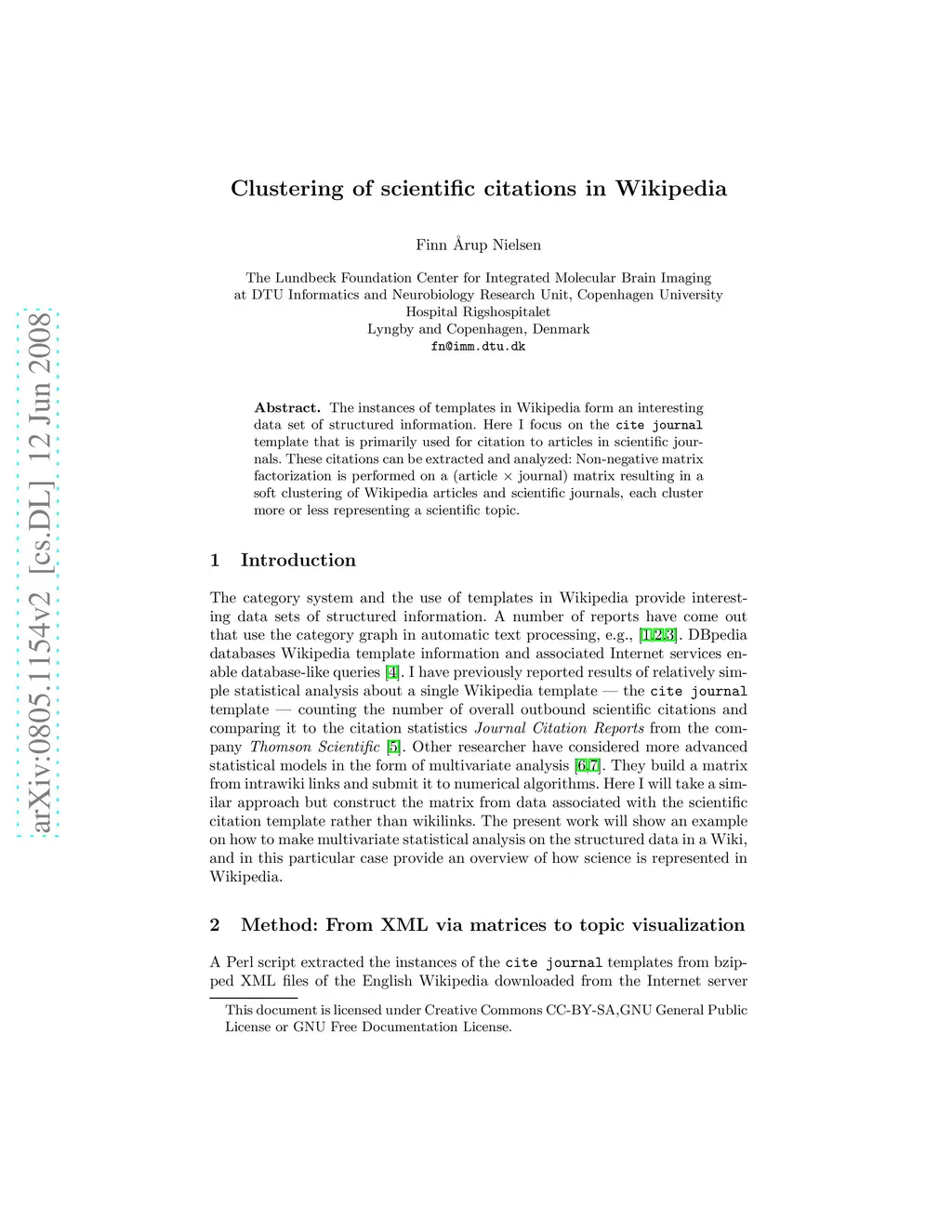 The instances of templates in Wikipedia form an interesting data set of structured information. Here I focus on the cite journal template that is primarily used for citation to articles in scientific journals. These citations can be extracted and analyzed: Non-negative matrix factorization is performed on a (article x journal) matrix resulting in a soft clustering of Wikipedia articles and scientific journals, each cluster more or less representing a scientific topic.