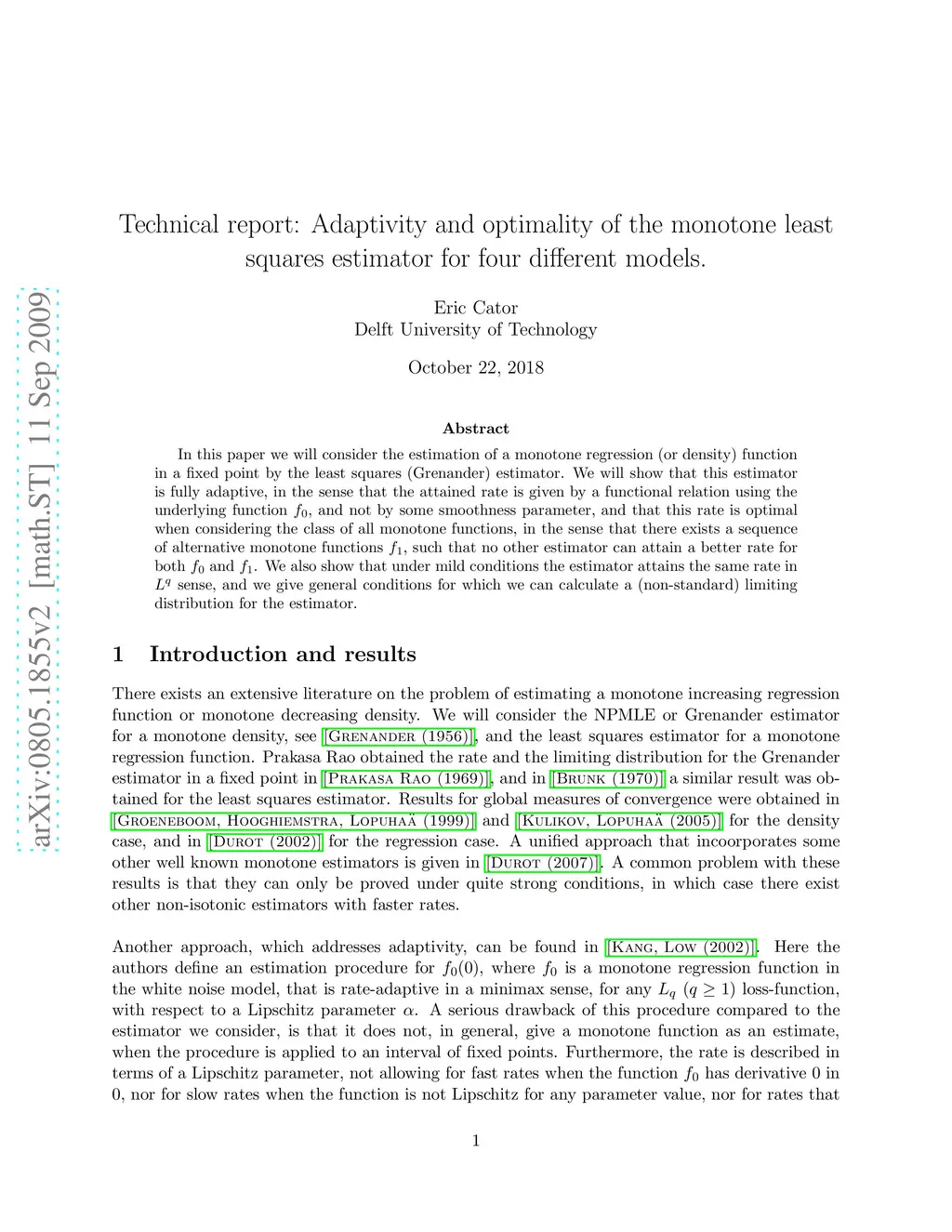 In this paper we will consider the estimation of a monotone regression (or density) function in a fixed point by the least squares (Grenander) estimator. We will show that this estimator is fully adaptive, in the sense that the attained rate is given by a functional relation using the underlying function , and not by some smoothness parameter, and that this rate is optimal when considering the class of all monotone functions, in the sense that there exists a sequence of alternative monotone functions , such that no other estimator can attain a better rate for both and . We also show that under mild conditions the estimator attains the same rate in sense, and we give general conditions for which we can calculate a (non-standard) limiting distribution for the estimator.