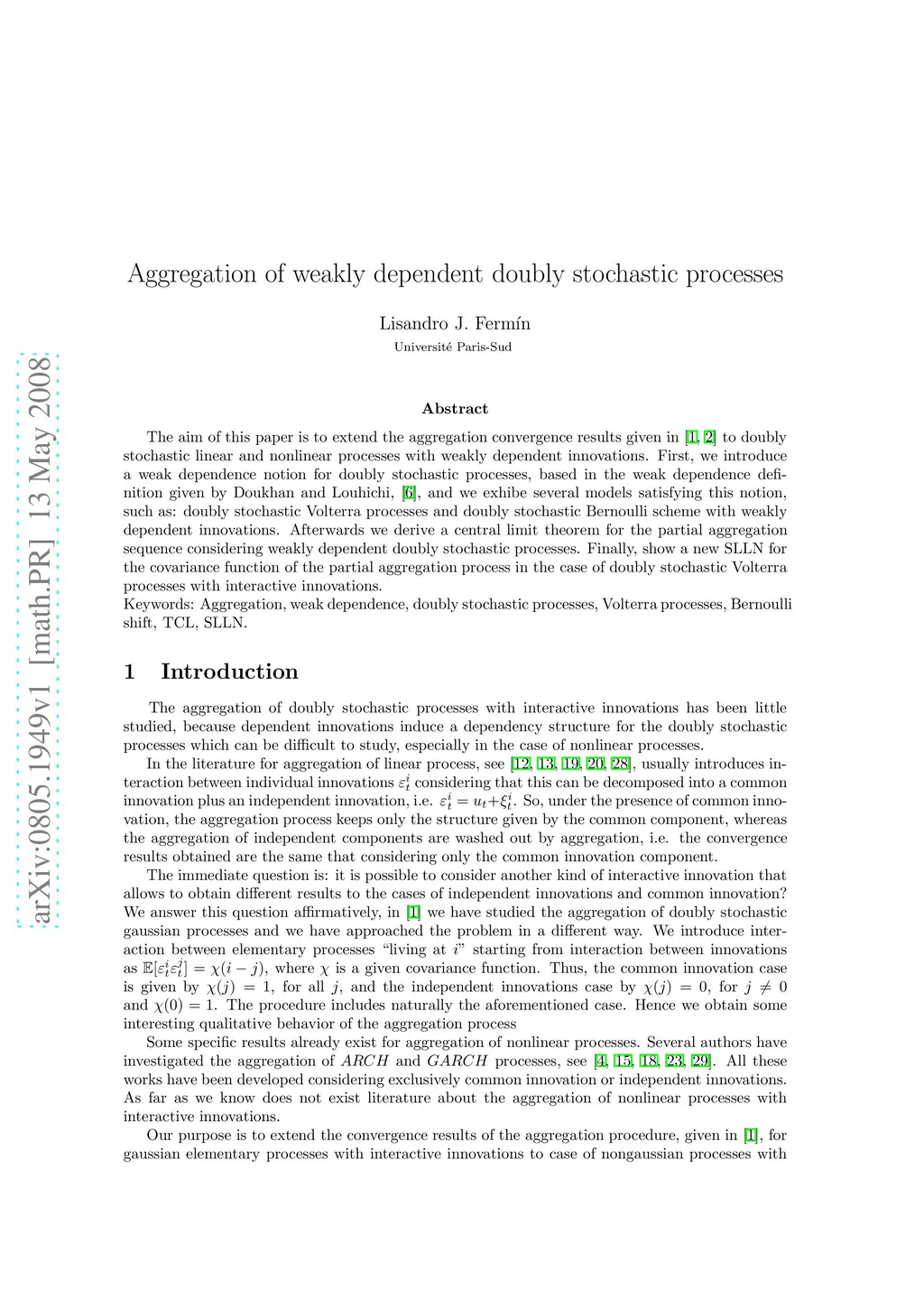 The aim of this paper is to extend the aggregation convergence results given in (Dacunha-Castelle and Fermin 2005, Dacunha-Castelle and Fermin 2008) to doubly stochastic linear and nonlinear processes with weakly dependent innovations. First, we introduce a weak dependence notion for doubly stochastic processes, based in the weak dependence definition given in (Doukhan and Louhichi 1999), and we exhibe several models satisfying this notion, such as: doubly stochastic Volterra processes and doubly stochastic Bernoulli scheme with weakly dependent innovations. Afterwards we derive a central limit theorem for the partial aggregation sequence considering weakly dependent doubly stochastic processes. Finally, show a new SLLN for the covariance function of the partial aggregation process in the case of doubly stochastic Volterra processes with interactive innovations. Keywords: Aggregation, weak dependence, doubly stochastic processes, Volterra processes, Bernoulli shift, TCL, SLLN.