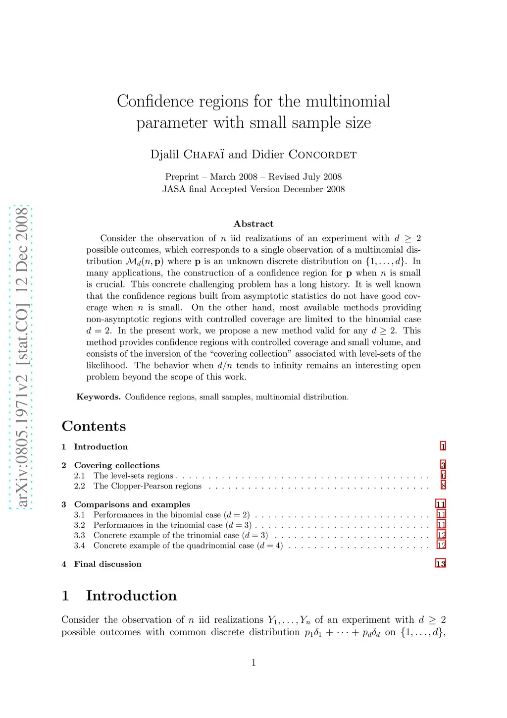 Consider the observation of n iid realizations of an experiment with d>1 possible outcomes, which corresponds to a single observation of a multinomial distribution M_d(n,p) where p is an unknown discrete distribution on {1,...,d}. In many applications in Biology, Medicine, Physics, and Engineering, the construction of a confidence region for p when is small is crucial. This challenging concrete problem has a long history. It is well known that the confidence regions build from asymptotic statistics do not have good coverage for small n. In the binomial case (d=2), Clopper and Pearson provided a nice way to construct non-asymptotic confidence regions. We show how to generalize their approach to any d, by using the concept of covering collections. We also propose an attractive new alternative method which provides small confidence regions of controlled coverage. It corresponds to a special covering collection based on level sets of the multinomial distribution. We compare the performance of our new method to various other methods, including a method of Wald based on the Central Limit Theorem, a method based on concentration of measure and deviation probabilities, and a Bayesian method based on Dirichlet-Jeffrey priors.