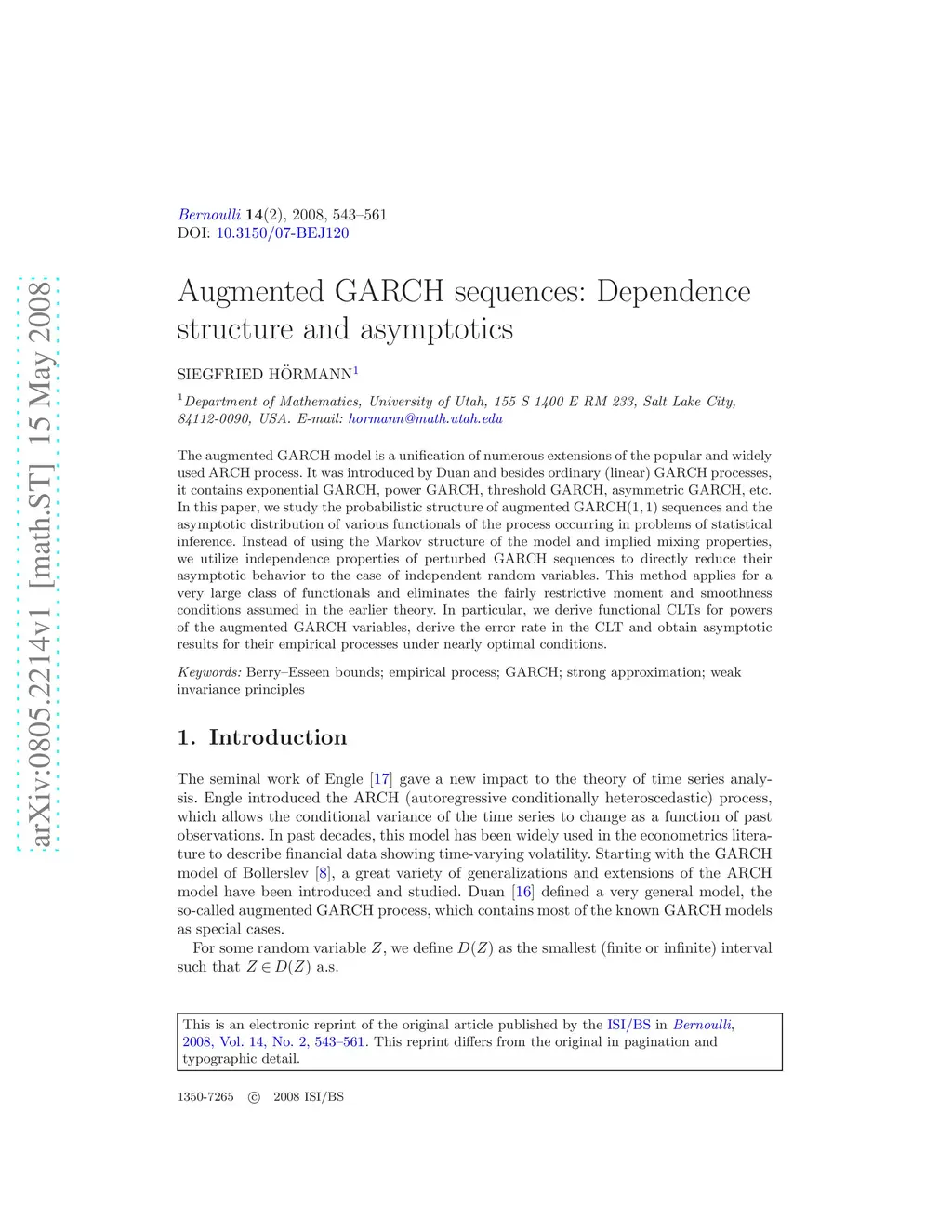 The augmented GARCH model is a unification of numerous extensions of the popular and widely used ARCH process. It was introduced by Duan and besides ordinary (linear) GARCH processes, it contains exponential GARCH, power GARCH, threshold GARCH, asymmetric GARCH, etc. In this paper, we study the probabilistic structure of augmented sequences and the asymptotic distribution of various functionals of the process occurring in problems of statistical inference. Instead of using the Markov structure of the model and implied mixing properties, we utilize independence properties of perturbed GARCH sequences to directly reduce their asymptotic behavior to the case of independent random variables. This method applies for a very large class of functionals and eliminates the fairly restrictive moment and smoothness conditions assumed in the earlier theory. In particular, we derive functional CLTs for powers of the augmented GARCH variables, derive the error rate in the CLT and obtain asymptotic results for their empirical processes under nearly optimal conditions.