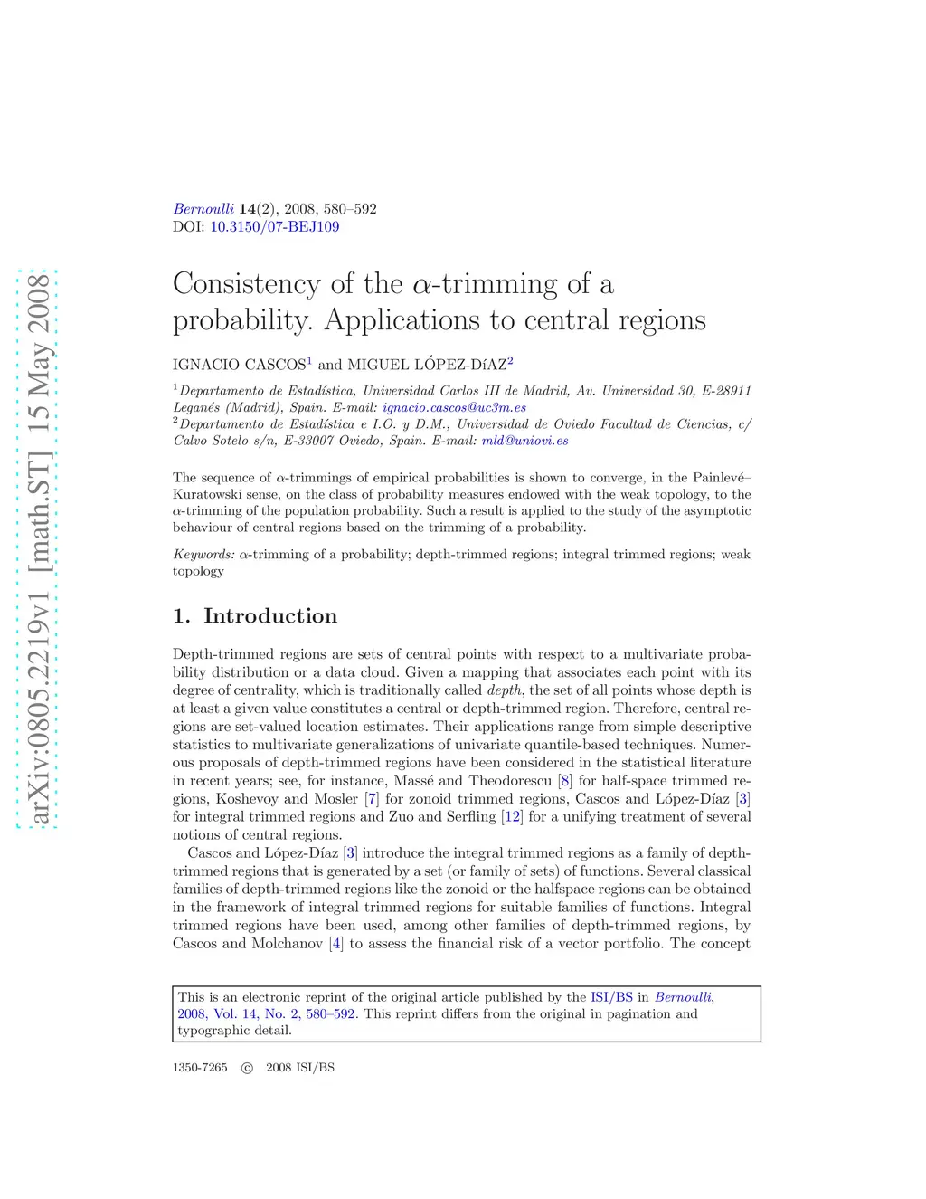 The sequence of -trimmings of empirical probabilities is shown to converge, in the Painlev\'{e}--Kuratowski sense, on the class of probability measures endowed with the weak topology, to the -trimming of the population probability. Such a result is applied to the study of the asymptotic behaviour of central regions based on the trimming of a probability.