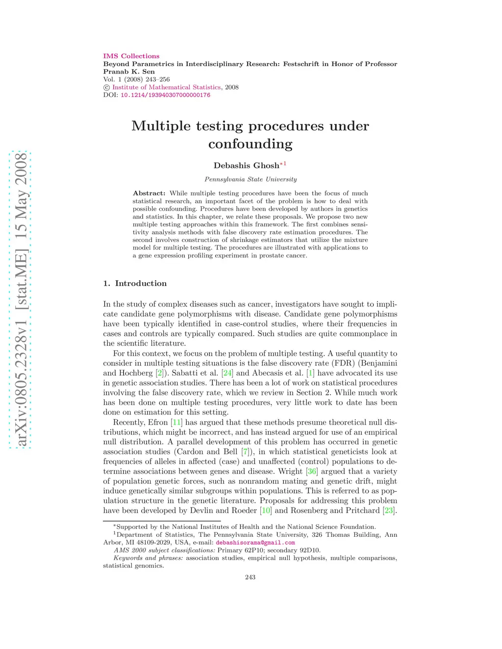 While multiple testing procedures have been the focus of much statistical research, an important facet of the problem is how to deal with possible confounding. Procedures have been developed by authors in genetics and statistics. In this chapter, we relate these proposals. We propose two new multiple testing approaches within this framework. The first combines sensitivity analysis methods with false discovery rate estimation procedures. The second involves construction of shrinkage estimators that utilize the mixture model for multiple testing. The procedures are illustrated with applications to a gene expression profiling experiment in prostate cancer.