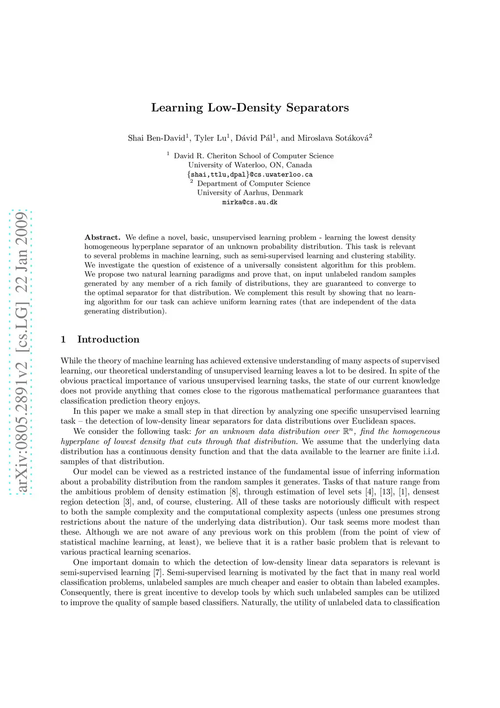 We define a novel, basic, unsupervised learning problem - learning the lowest density homogeneous hyperplane separator of an unknown probability distribution. This task is relevant to several problems in machine learning, such as semi-supervised learning and clustering stability. We investigate the question of existence of a universally consistent algorithm for this problem. We propose two natural learning paradigms and prove that, on input unlabeled random samples generated by any member of a rich family of distributions, they are guaranteed to converge to the optimal separator for that distribution. We complement this result by showing that no learning algorithm for our task can achieve uniform learning rates (that are independent of the data generating distribution).
