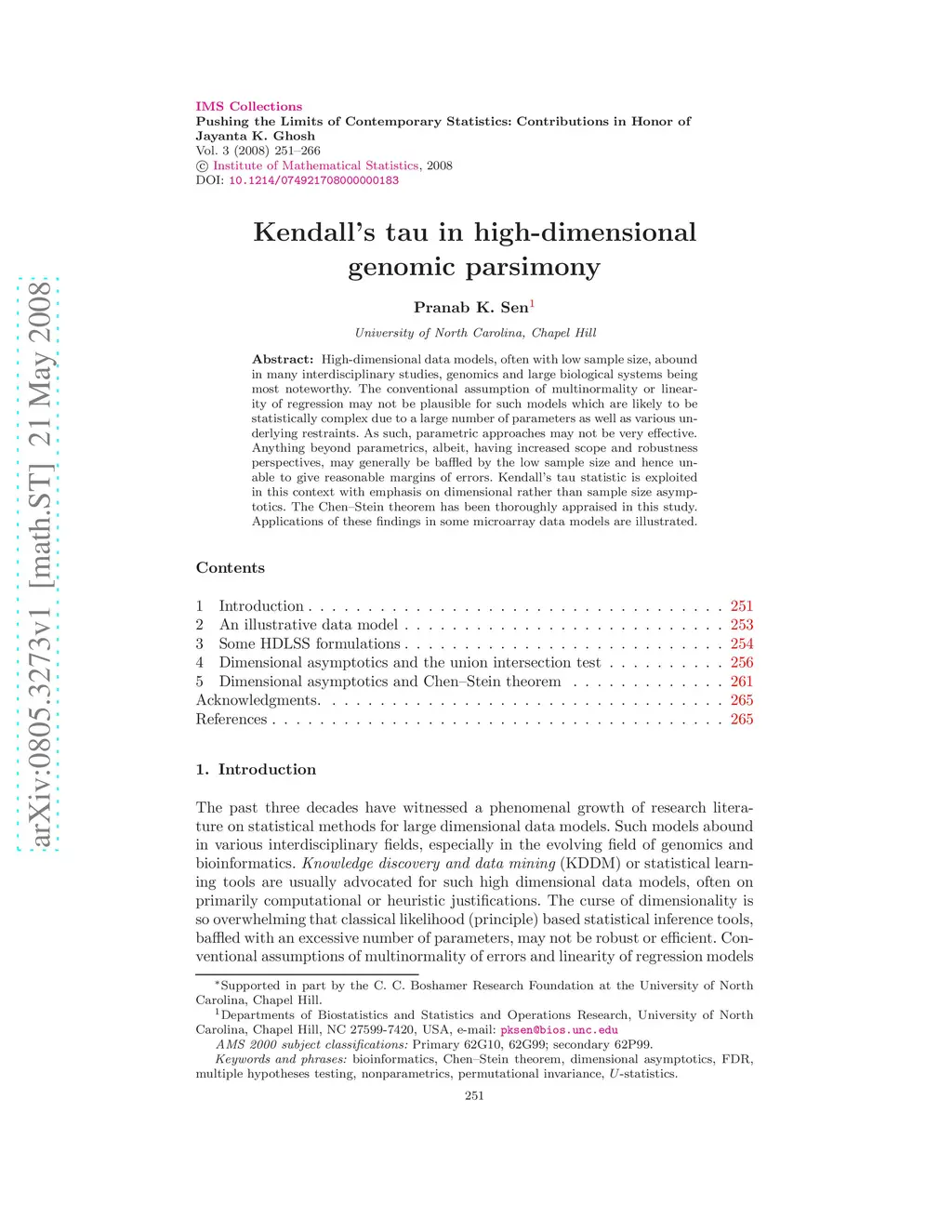 High-dimensional data models, often with low sample size, abound in many interdisciplinary studies, genomics and large biological systems being most noteworthy. The conventional assumption of multinormality or linearity of regression may not be plausible for such models which are likely to be statistically complex due to a large number of parameters as well as various underlying restraints. As such, parametric approaches may not be very effective. Anything beyond parametrics, albeit, having increased scope and robustness perspectives, may generally be baffled by the low sample size and hence unable to give reasonable margins of errors. Kendall's tau statistic is exploited in this context with emphasis on dimensional rather than sample size asymptotics. The Chen--Stein theorem has been thoroughly appraised in this study. Applications of these findings in some microarray data models are illustrated.