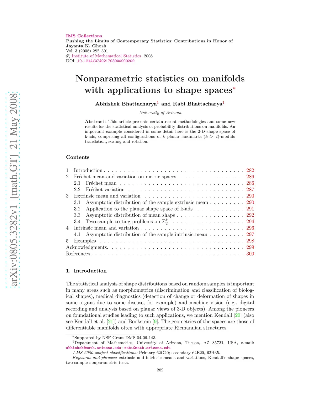This article presents certain recent methodologies and some new results for the statistical analysis of probability distributions on manifolds. An important example considered in some detail here is the 2-D shape space of k-ads, comprising all configurations of planar landmarks ()-modulo translation, scaling and rotation.