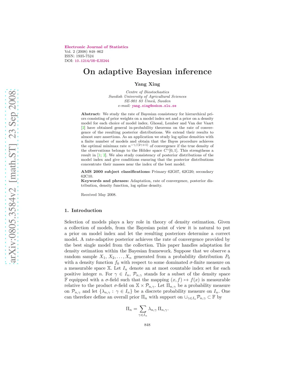 We study the rate of Bayesian consistency for hierarchical priors consisting of prior weights on a model index set and a prior on a density model for each choice of model index. Ghosal, Lember and Van der Vaart [2] have obtained general in-probability theorems on the rate of convergence of the resulting posterior distributions. We extend their results to almost sure assertions. As an application we study log spline densities with a finite number of models and obtain that the Bayes procedure achieves the optimal minimax rate of convergence if the true density of the observations belongs to the H\"{o}lder space . This strengthens a result in [1; 2]. We also study consistency of posterior distributions of the model index and give conditions ensuring that the posterior distributions concentrate their masses near the index of the best model.