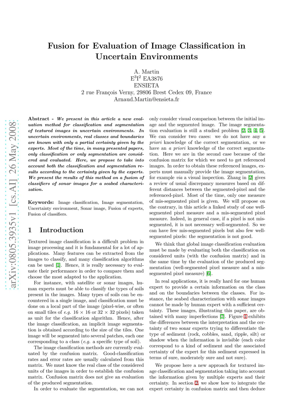 We present in this article a new evaluation method for classification and segmentation of textured images in uncertain environments. In uncertain environments, real classes and boundaries are known with only a partial certainty given by the experts. Most of the time, in many presented papers, only classification or only segmentation are considered and evaluated. Here, we propose to take into account both the classification and segmentation results according to the certainty given by the experts. We present the results of this method on a fusion of classifiers of sonar images for a seabed characterization.