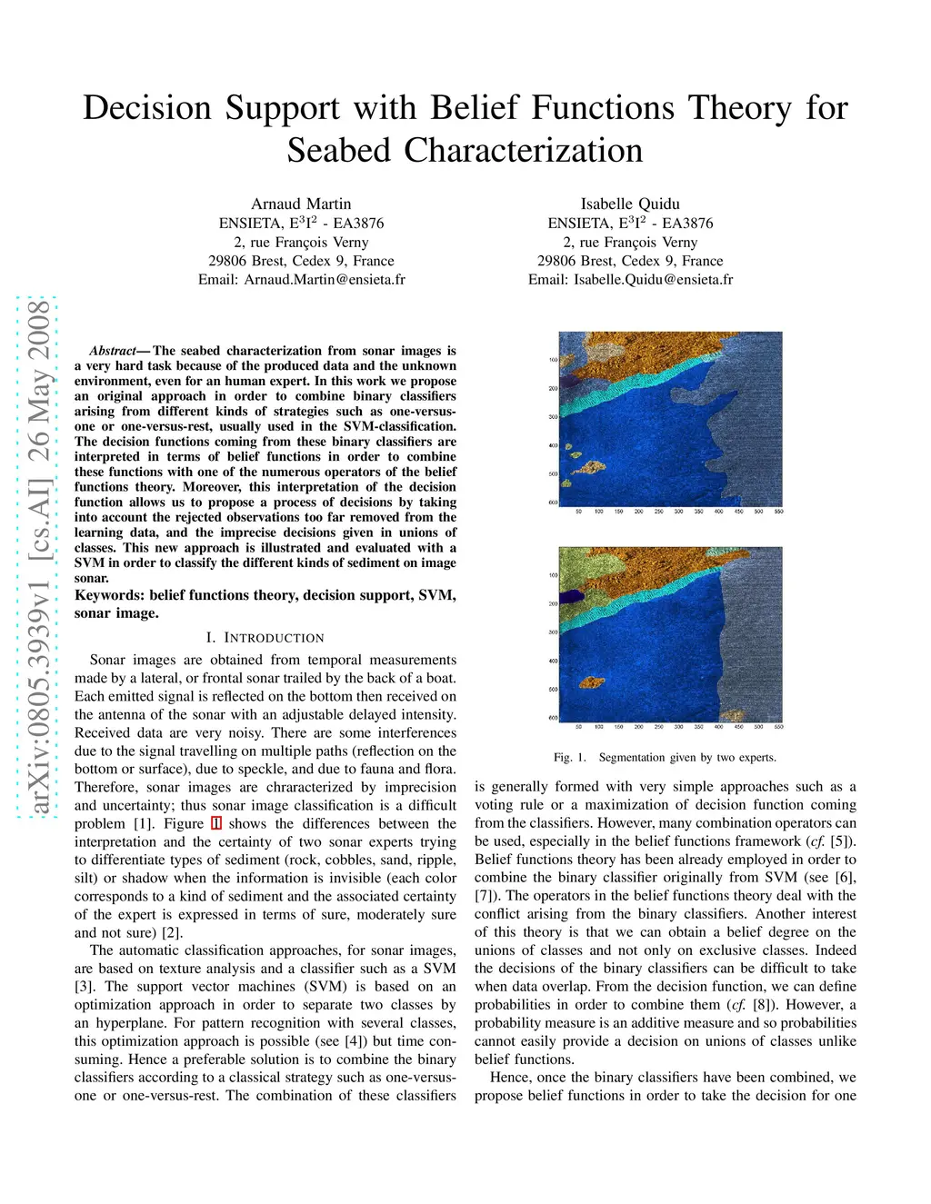 The seabed characterization from sonar images is a very hard task because of the produced data and the unknown environment, even for an human expert. In this work we propose an original approach in order to combine binary classifiers arising from different kinds of strategies such as one-versus-one or one-versus-rest, usually used in the SVM-classification. The decision functions coming from these binary classifiers are interpreted in terms of belief functions in order to combine these functions with one of the numerous operators of the belief functions theory. Moreover, this interpretation of the decision function allows us to propose a process of decisions by taking into account the rejected observations too far removed from the learning data, and the imprecise decisions given in unions of classes. This new approach is illustrated and evaluated with a SVM in order to classify the different kinds of sediment on image sonar.