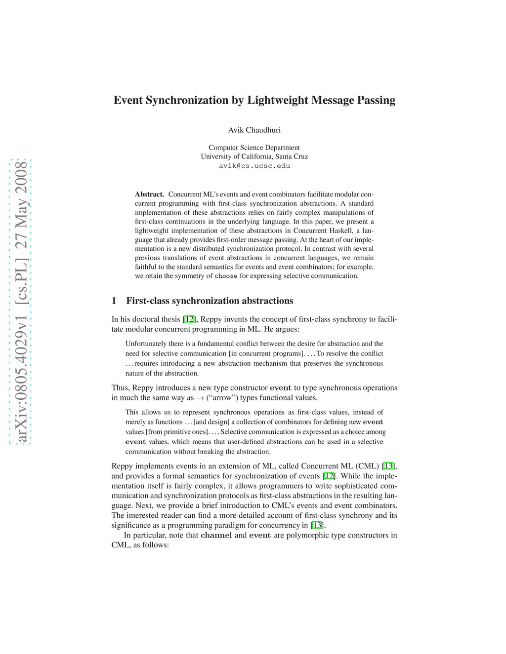 Concurrent ML's events and event combinators facilitate modular concurrent programming with first-class synchronization abstractions. A standard implementation of these abstractions relies on fairly complex manipulations of first-class continuations in the underlying language. In this paper, we present a lightweight implementation of these abstractions in Concurrent Haskell, a language that already provides first-order message passing. At the heart of our implementation is a new distributed synchronization protocol. In contrast with several previous translations of event abstractions in concurrent languages, we remain faithful to the standard semantics for events and event combinators; for example, we retain the symmetry of for expressing selective communication.