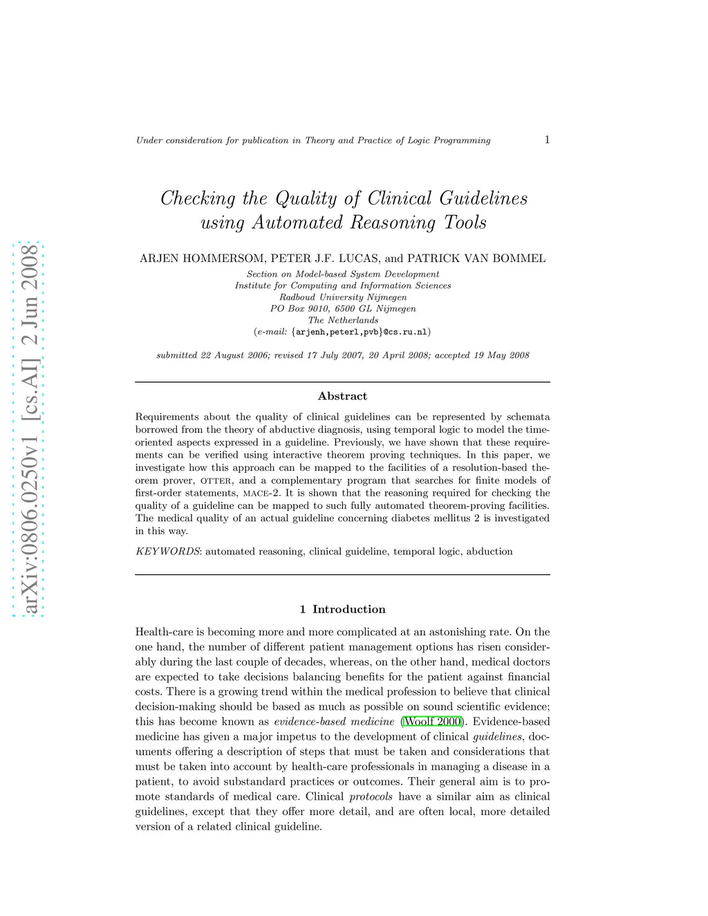 Requirements about the quality of clinical guidelines can be represented by schemata borrowed from the theory of abductive diagnosis, using temporal logic to model the time-oriented aspects expressed in a guideline. Previously, we have shown that these requirements can be verified using interactive theorem proving techniques. In this paper, we investigate how this approach can be mapped to the facilities of a resolution-based theorem prover, Otter, and a complementary program that searches for finite models of first-order statements, Mace. It is shown that the reasoning required for checking the quality of a guideline can be mapped to such fully automated theorem-proving facilities. The medical quality of an actual guideline concerning diabetes mellitus 2 is investigated in this way.