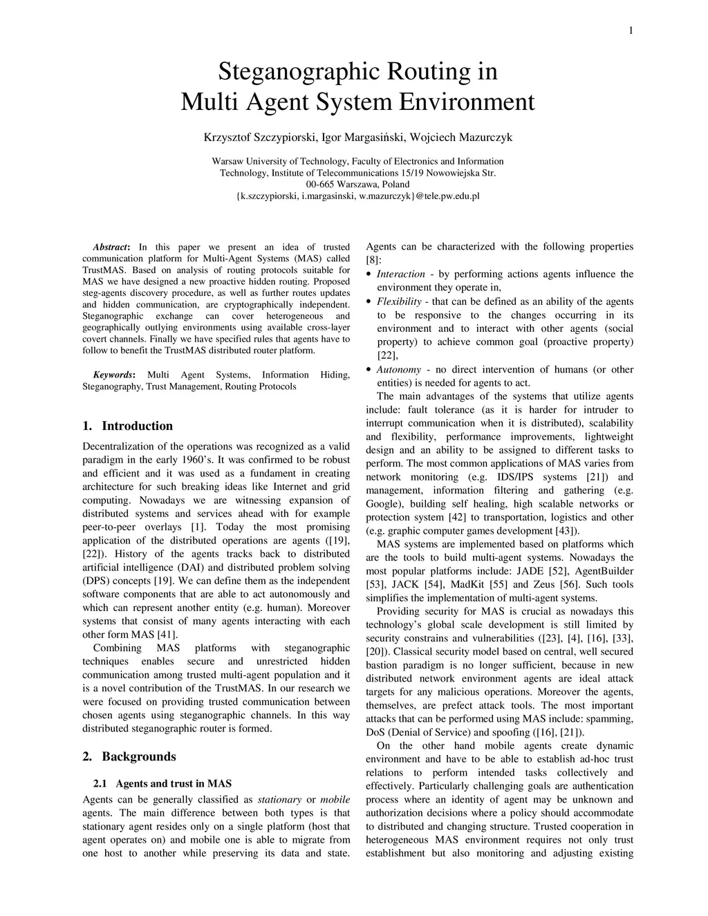 In this paper we present an idea of trusted communication platform for Multi-Agent Systems (MAS) called TrustMAS. Based on analysis of routing protocols suitable for MAS we have designed a new proactive hidden routing. Proposed steg-agents discovery procedure, as well as further routes updates and hidden communication, are cryptographically independent. Steganographic exchange can cover heterogeneous and geographically outlying environments using available cross-layer covert channels. Finally we have specified rules that agents have to follow to benefit the TrustMAS distributed router platform.