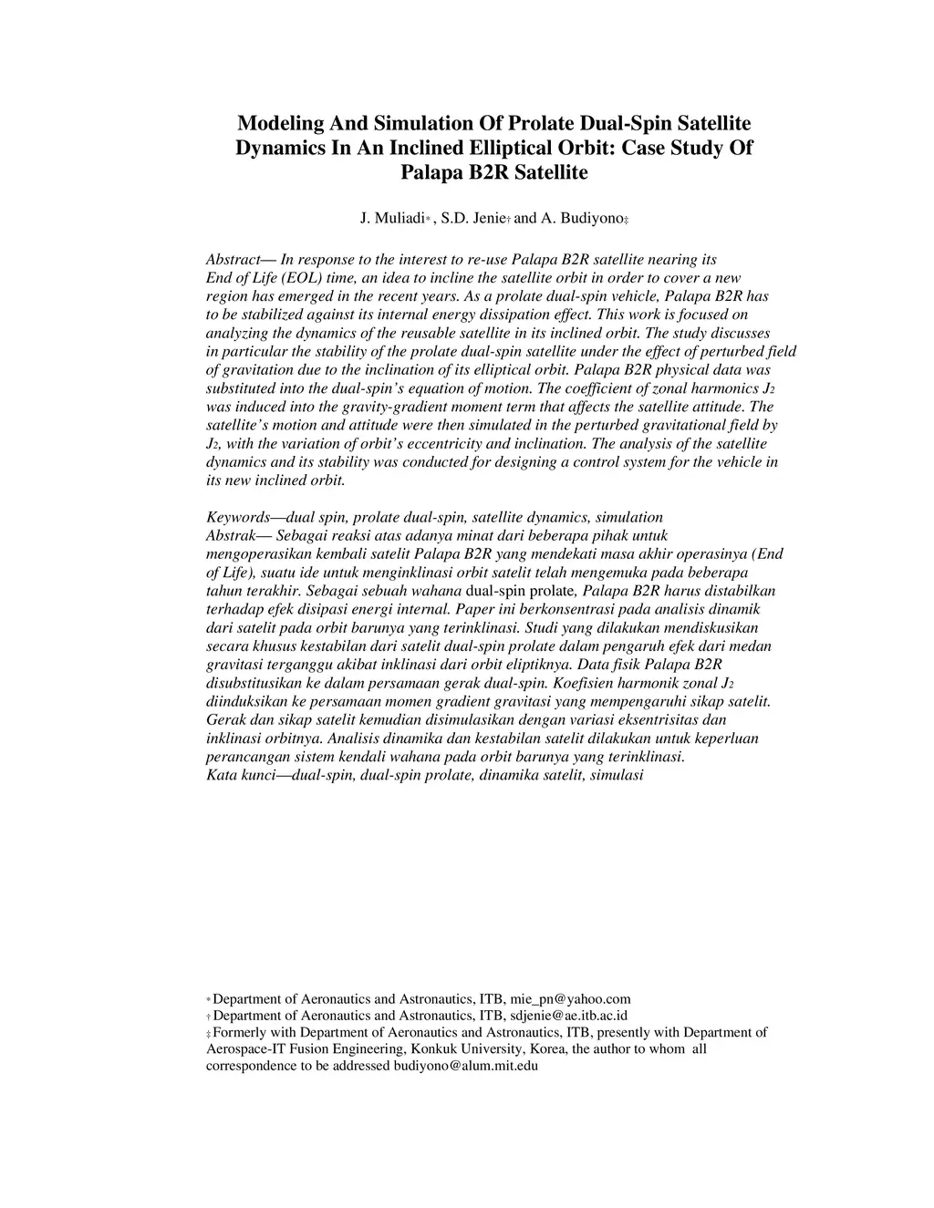 In response to the interest to re-use Palapa B2R satellite nearing its End of Life (EOL) time, an idea to incline the satellite orbit in order to cover a new region has emerged in the recent years. As a prolate dual-spin vehicle, Palapa B2R has to be stabilized against its internal energy dissipation effect. This work is focused on analyzing the dynamics of the reusable satellite in its inclined orbit. The study discusses in particular the stability of the prolate dual-spin satellite under the effect of perturbed field of gravitation due to the inclination of its elliptical orbit. Palapa B2R physical data was substituted into the dual-spin's equation of motion. The coefficient of zonal harmonics J2 was induced into the gravity-gradient moment term that affects the satellite attitude. The satellite's motion and attitude were then simulated in the perturbed gravitational field by J2, with the variation of orbit's eccentricity and inclination. The analysis of the satellite dynamics and its stability was conducted for designing a control system for the vehicle in its new inclined orbit.
