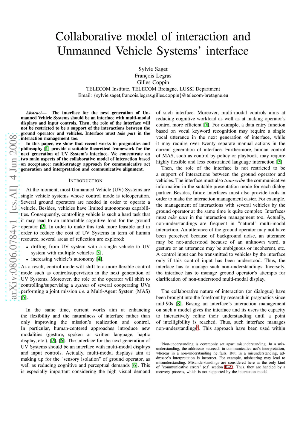 The interface for the next generation of Unmanned Vehicle Systems should be an interface with multi-modal displays and input controls. Then, the role of the interface will not be restricted to be a support of the interactions between the ground operator and vehicles. Interface must take part in the interaction management too. In this paper, we show that recent works in pragmatics and philosophy provide a suitable theoretical framework for the next generation of UV System's interface. We concentrate on two main aspects of the collaborative model of interaction based on acceptance: multi-strategy approach for communicative act generation and interpretation and communicative alignment.