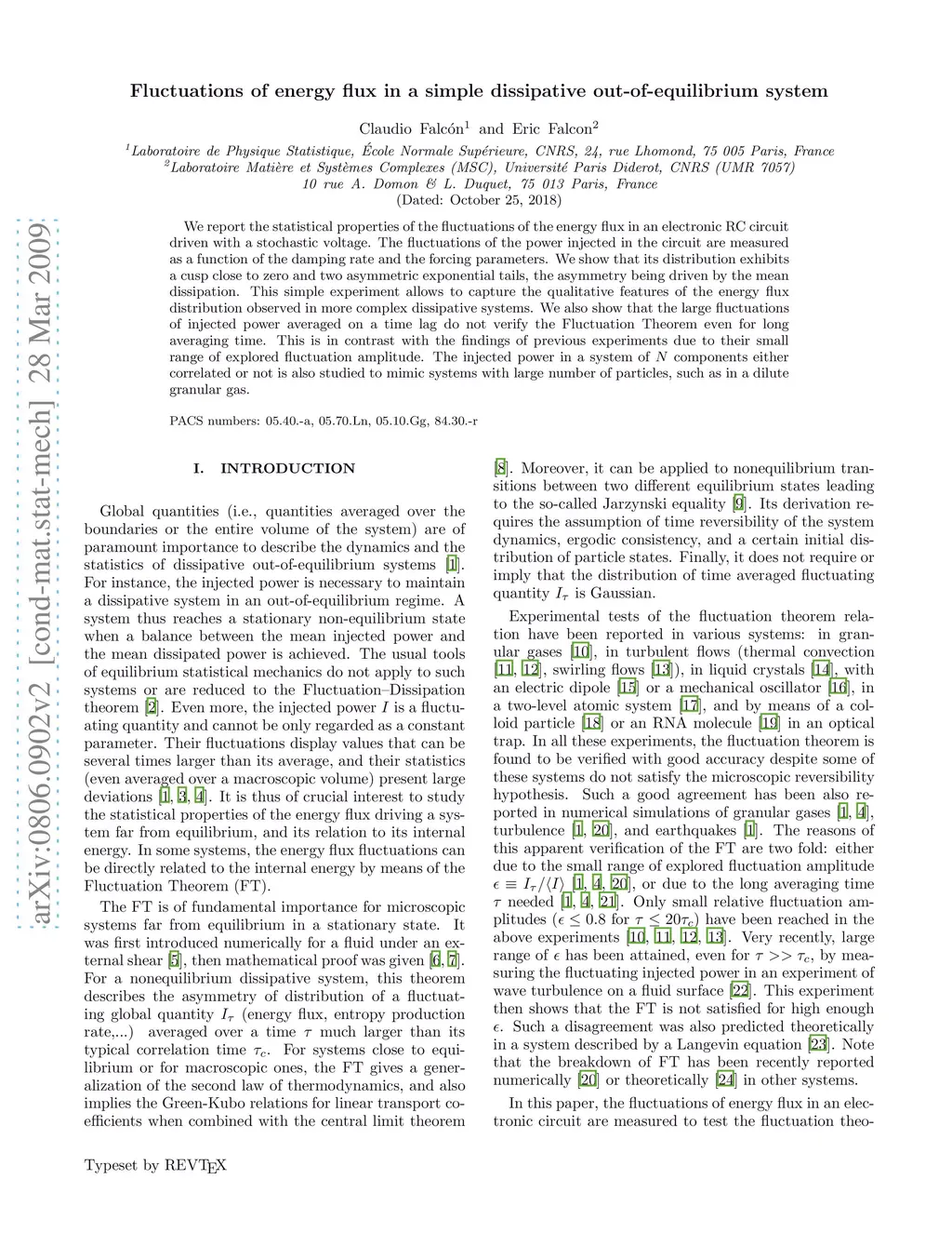 We report the statistical properties of the fluctuations of the energy flux in an electronic RC circuit driven with a stochastic voltage. The fluctuations of the power injected in the circuit are measured as a function of the damping rate and the forcing parameters. We show that its distribution exhibits a cusp close to zero and two asymmetric exponential tails, the asymmetry being driven by the mean dissipation. This simple experiment allows to capture the qualitative features of the energy flux distribution observed in more complex dissipative systems. We also show that the large fluctuations of injected power averaged on a time lag do not verify the Fluctuation Theorem even for long averaging time. This is in contrast with the findings of previous experiments due to their small range of explored fluctuation amplitude. The injected power in a system of N components either correlated or not is also studied to mimic systems with large number of particles, such as in a dilute granular gas.