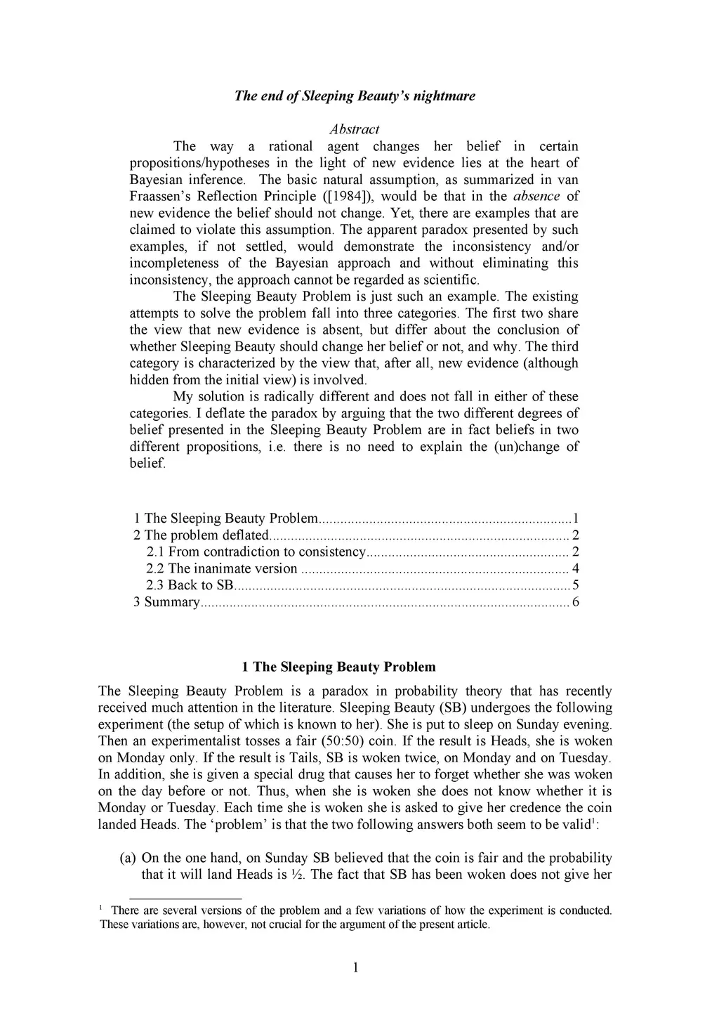 The way a rational agent changes her belief in certain propositions/hypotheses in the light of new evidence lies at the heart of Bayesian inference. The basic natural assumption, as summarized in van Fraassen's Reflection Principle ([1984]), would be that in the absence of new evidence the belief should not change. Yet, there are examples that are claimed to violate this assumption. The apparent paradox presented by such examples, if not settled, would demonstrate the inconsistency and/or incompleteness of the Bayesian approach and without eliminating this inconsistency, the approach cannot be regarded as scientific. The Sleeping Beauty Problem is just such an example. The existing attempts to solve the problem fall into three categories. The first two share the view that new evidence is absent, but differ about the conclusion of whether Sleeping Beauty should change her belief or not, and why. The third category is characterized by the view that, after all, new evidence (although hidden from the initial view) is involved. My solution is radically different and does not fall in either of these categories. I deflate the paradox by arguing that the two different degrees of belief presented in the Sleeping Beauty Problem are in fact beliefs in two different propositions, i.e. there is no need to explain the (un)change of belief.