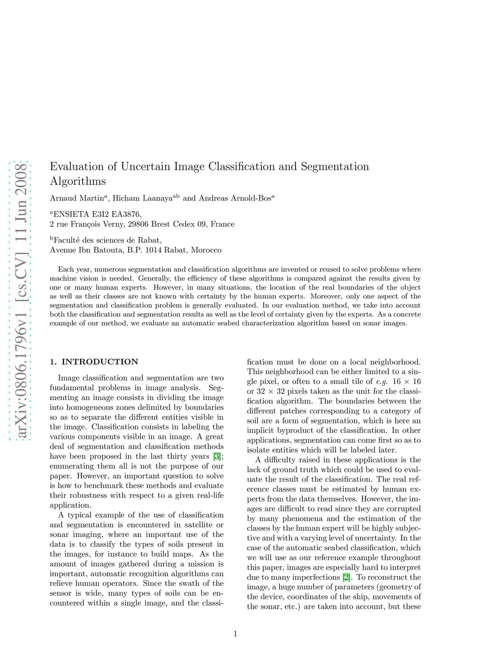 Each year, numerous segmentation and classification algorithms are invented or reused to solve problems where machine vision is needed. Generally, the efficiency of these algorithms is compared against the results given by one or many human experts. However, in many situations, the location of the real boundaries of the objects as well as their classes are not known with certainty by the human experts. Furthermore, only one aspect of the segmentation and classification problem is generally evaluated. In this paper we present a new evaluation method for classification and segmentation of image, where we take into account both the classification and segmentation results as well as the level of certainty given by the experts. As a concrete example of our method, we evaluate an automatic seabed characterization algorithm based on sonar images.