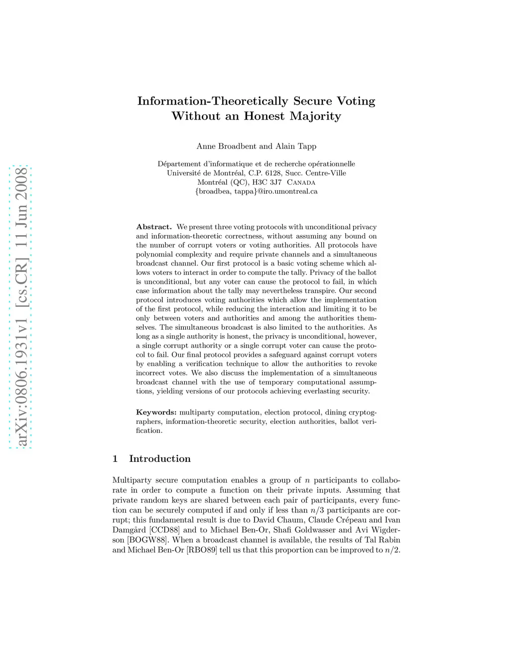 We present three voting protocols with unconditional privacy and information-theoretic correctness, without assuming any bound on the number of corrupt voters or voting authorities. All protocols have polynomial complexity and require private channels and a simultaneous broadcast channel. Our first protocol is a basic voting scheme which allows voters to interact in order to compute the tally. Privacy of the ballot is unconditional, but any voter can cause the protocol to fail, in which case information about the tally may nevertheless transpire. Our second protocol introduces voting authorities which allow the implementation of the first protocol, while reducing the interaction and limiting it to be only between voters and authorities and among the authorities themselves. The simultaneous broadcast is also limited to the authorities. As long as a single authority is honest, the privacy is unconditional, however, a single corrupt authority or a single corrupt voter can cause the protocol to fail. Our final protocol provides a safeguard against corrupt voters by enabling a verification technique to allow the authorities to revoke incorrect votes. We also discuss the implementation of a simultaneous broadcast channel with the use of temporary computational assumptions, yielding versions of our protocols achieving everlasting security.