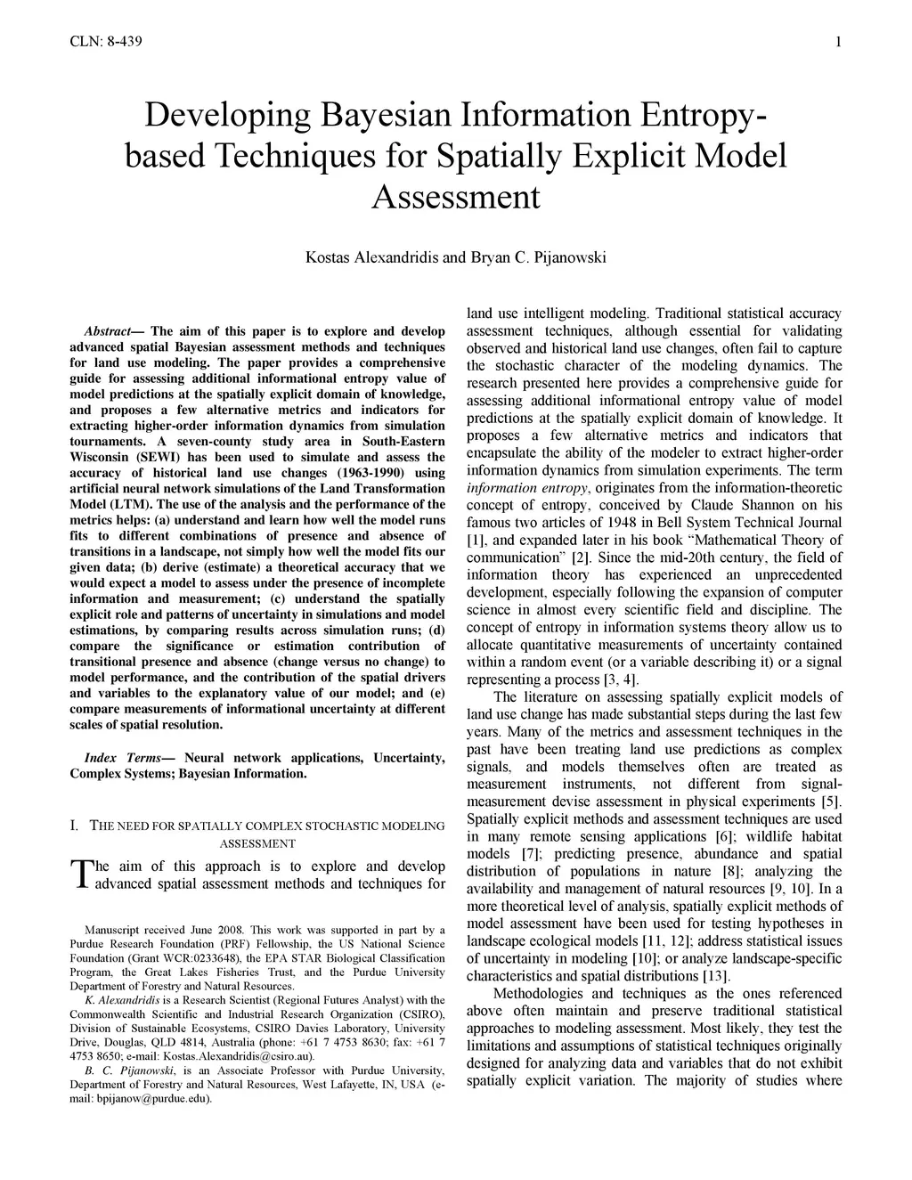 The aim of this paper is to explore and develop advanced spatial Bayesian assessment methods and techniques for land use modeling. The paper provides a comprehensive guide for assessing additional informational entropy value of model predictions at the spatially explicit domain of knowledge, and proposes a few alternative metrics and indicators for extracting higher-order information dynamics from simulation tournaments. A seven-county study area in South-Eastern Wisconsin (SEWI) has been used to simulate and assess the accuracy of historical land use changes (1963-1990) using artificial neural network simulations of the Land Transformation Model (LTM). The use of the analysis and the performance of the metrics helps: (a) understand and learn how well the model runs fits to different combinations of presence and absence of transitions in a landscape, not simply how well the model fits our given data; (b) derive (estimate) a theoretical accuracy that we would expect a model to assess under the presence of incomplete information and measurement; (c) understand the spatially explicit role and patterns of uncertainty in simulations and model estimations, by comparing results across simulation runs; (d) compare the significance or estimation contribution of transitional presence and absence (change versus no change) to model performance, and the contribution of the spatial drivers and variables to the explanatory value of our model; and (e) compare measurements of informational uncertainty at different scales of spatial resolution.