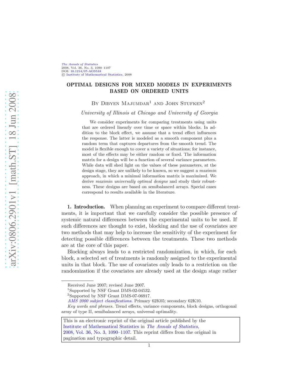 We consider experiments for comparing treatments using units that are ordered linearly over time or space within blocks. In addition to the block effect, we assume that a trend effect influences the response. The latter is modeled as a smooth component plus a random term that captures departures from the smooth trend. The model is flexible enough to cover a variety of situations; for instance, most of the effects may be either random or fixed. The information matrix for a design will be a function of several variance parameters. While data will shed light on the values of these parameters, at the design stage, they are unlikely to be known, so we suggest a maximin approach, in which a minimal information matrix is maximized. We derive maximin universally optimal designs and study their robustness. These designs are based on semibalanced arrays. Special cases correspond to results available in the literature.