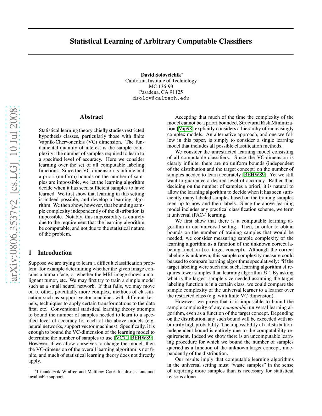 Statistical Learning of Arbitrary Computable Classifiers