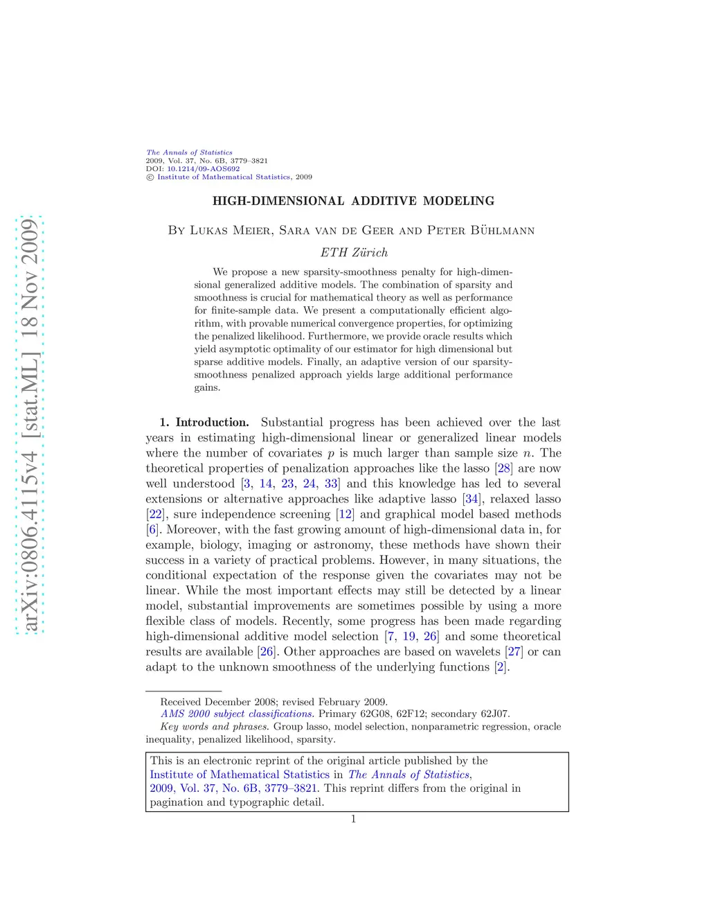 We propose a new sparsity-smoothness penalty for high-dimensional generalized additive models. The combination of sparsity and smoothness is crucial for mathematical theory as well as performance for finite-sample data. We present a computationally efficient algorithm, with provable numerical convergence properties, for optimizing the penalized likelihood. Furthermore, we provide oracle results which yield asymptotic optimality of our estimator for high dimensional but sparse additive models. Finally, an adaptive version of our sparsity-smoothness penalized approach yields large additional performance gains.