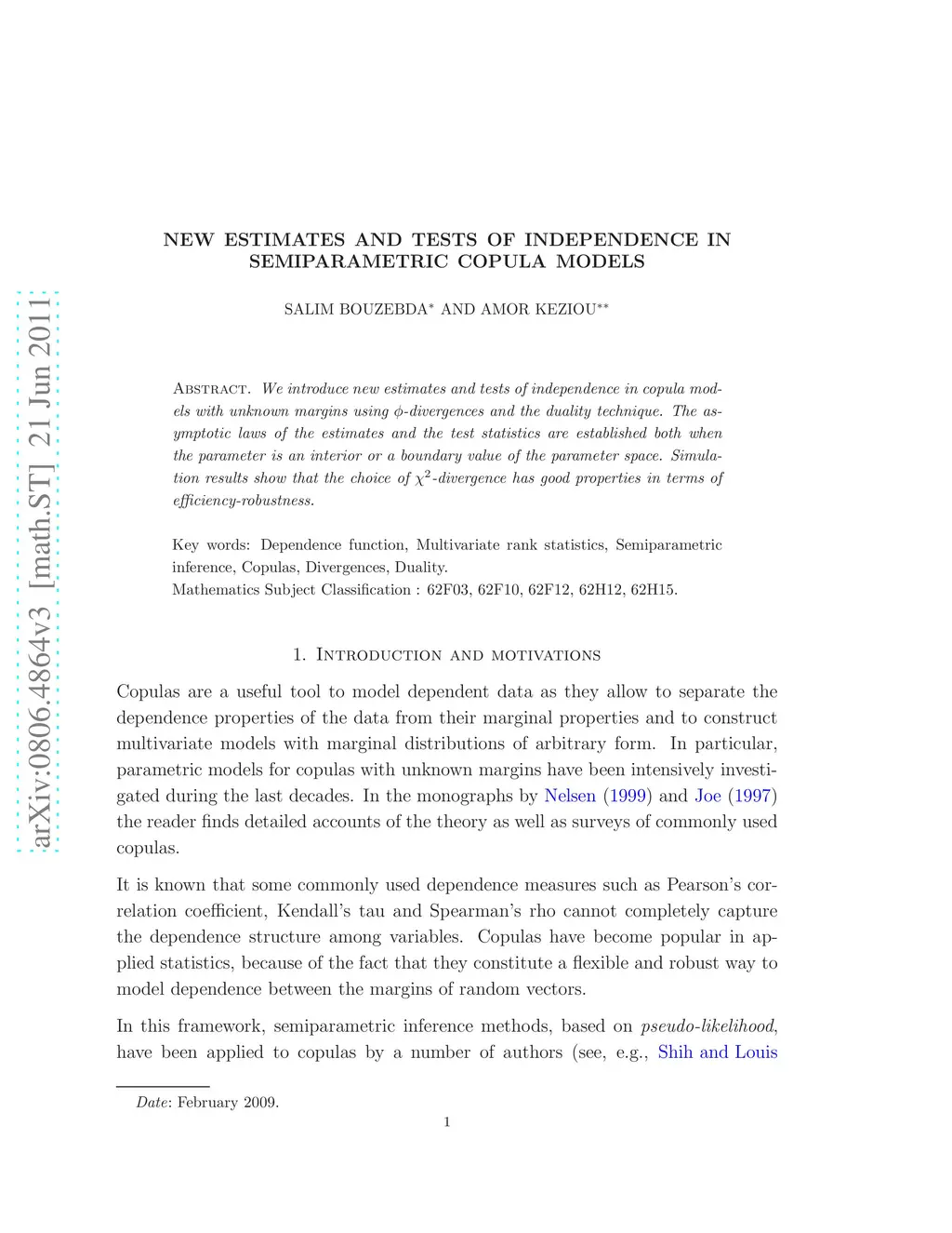 We introduce new estimates and tests of independence in copula models with unknown margins using -divergences and the duality technique. The asymptotic laws of the estimates and the test statistics are established both when the parameter is an interior or a boundary value of the parameter space. Simulation results show that the choice of -divergence has good properties in terms of efficiency-robustness.