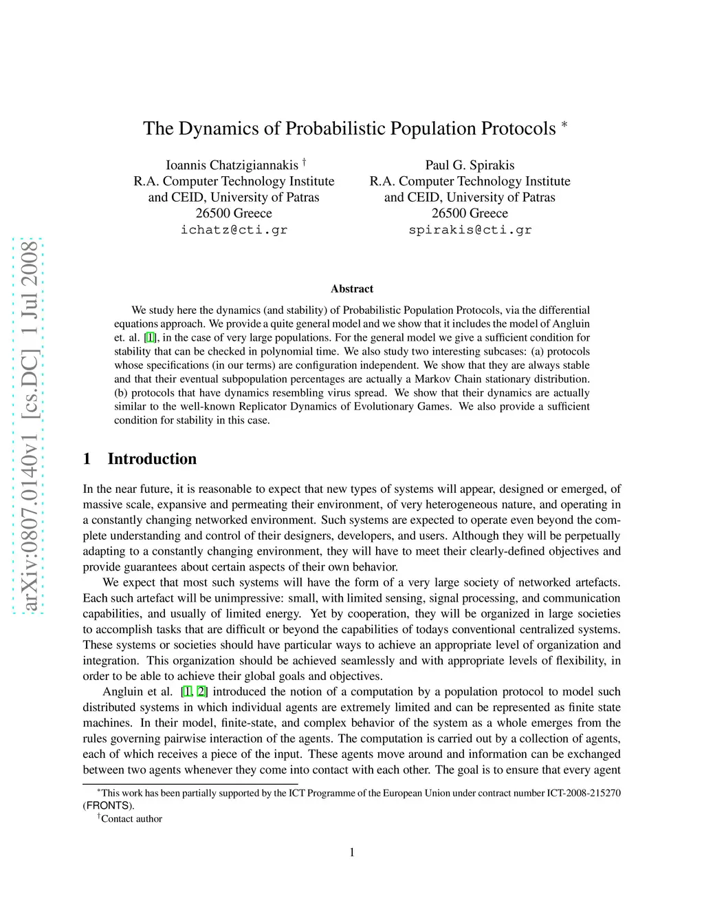 We study here the dynamics (and stability) of Probabilistic Population Protocols, via the differential equations approach. We provide a quite general model and we show that it includes the model of Angluin et. al. in the case of very large populations. For the general model we give a sufficient condition for stability that can be checked in polynomial time. We also study two interesting subcases: (a) protocols whose specifications (in our terms) are configuration independent. We show that they are always stable and that their eventual subpopulation percentages are actually a Markov Chain stationary distribution. (b) protocols that have dynamics resembling virus spread. We show that their dynamics are actually similar to the well-known Replicator Dynamics of Evolutionary Games. We also provide a sufficient condition for stability in this case.