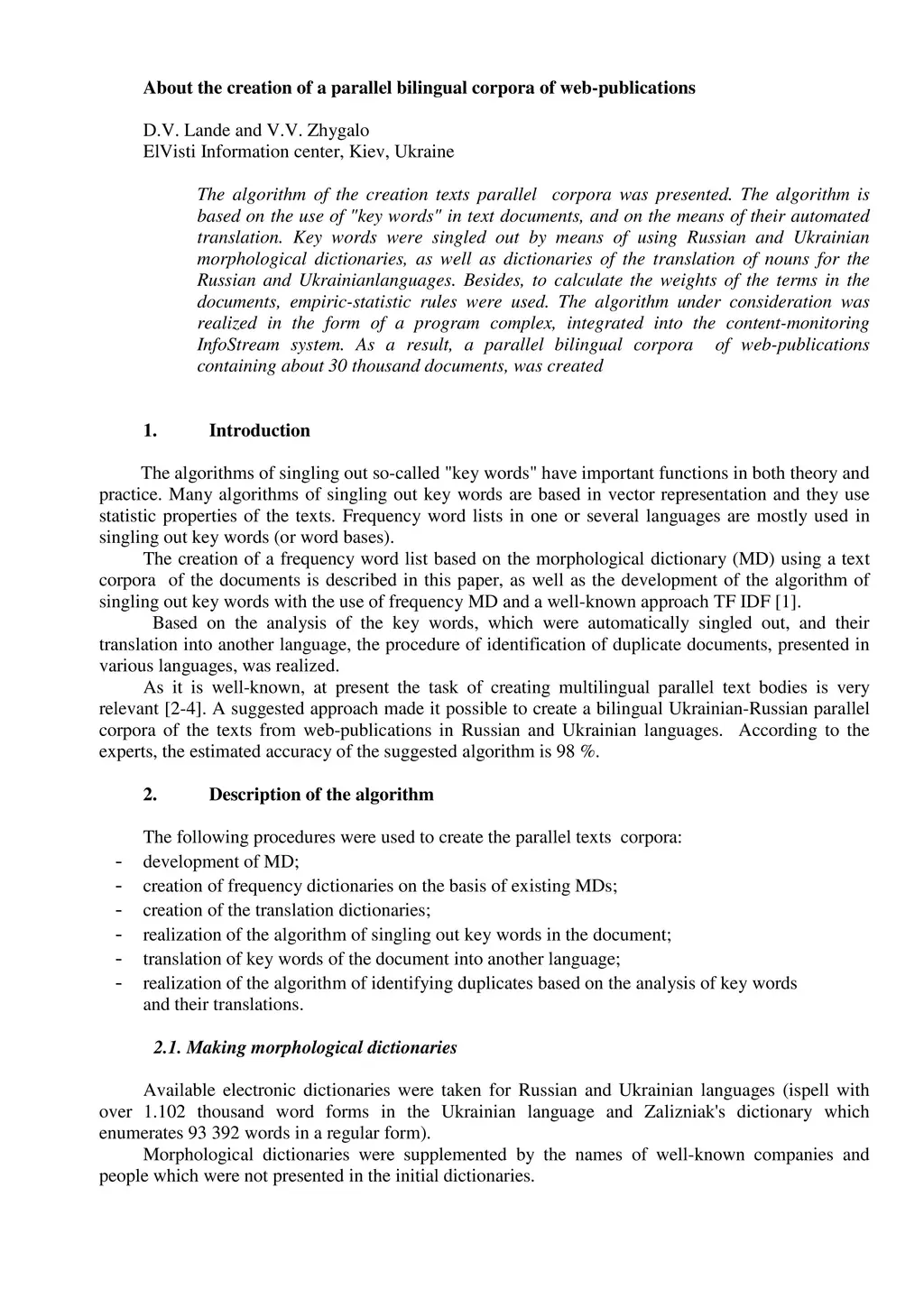 The algorithm of the creation texts parallel corpora was presented. The algorithm is based on the use of "key words" in text documents, and on the means of their automated translation. Key words were singled out by means of using Russian and Ukrainian morphological dictionaries, as well as dictionaries of the translation of nouns for the Russian and Ukrainianlanguages. Besides, to calculate the weights of the terms in the documents, empiric-statistic rules were used. The algorithm under consideration was realized in the form of a program complex, integrated into the content-monitoring InfoStream system. As a result, a parallel bilingual corpora of web-publications containing about 30 thousand documents, was created
