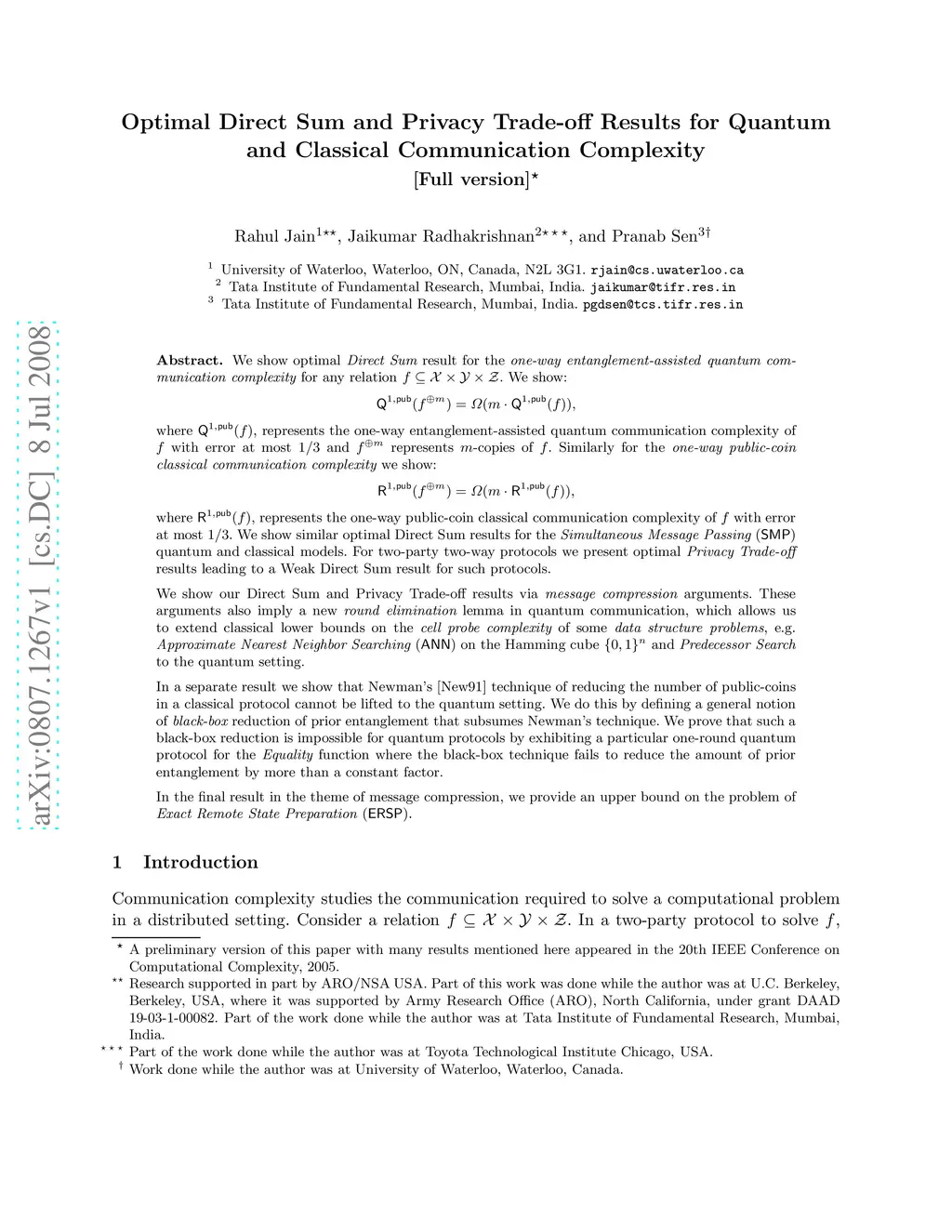 We show optimal Direct Sum result for the one-way entanglement-assisted quantum communication complexity for any relation f subset of X x Y x Z. We show: Q^{1,pub}(f^m) = Omega(m Q^{1,pub}(f)), where Q^{1,pub}(f), represents the one-way entanglement-assisted quantum communication complexity of f with error at most 1/3 and f^m represents m-copies of f. Similarly for the one-way public-coin classical communication complexity we show: R^{1,pub}(f^m) = Omega(m R^{1,pub}(f)), where R^{1,pub}(f), represents the one-way public-coin classical communication complexity of f with error at most 1/3. We show similar optimal Direct Sum results for the Simultaneous Message Passing quantum and classical models. For two-way protocols we present optimal Privacy Trade-off results leading to a Weak Direct Sum result for such protocols. We show our Direct Sum and Privacy Trade-off results via message compression arguments which also imply a new round elimination lemma in quantum communication. This allows us to extend classical lower bounds on the cell probe complexity of some data structure problems, e.g. Approximate Nearest Neighbor Searching on the Hamming cube {0,1}^n and Predecessor Search to the quantum setting. In a separate result we show that Newman's technique of reducing the number of public-coins in a classical protocol cannot be lifted to the quantum setting. We do this by defining a general notion of black-box reduction of prior entanglement that subsumes Newman's technique. We prove that such a black-box reduction is impossible for quantum protocols. In the final result in the theme of message compression, we provide an upper bound on the problem of Exact Remote State Preparation.