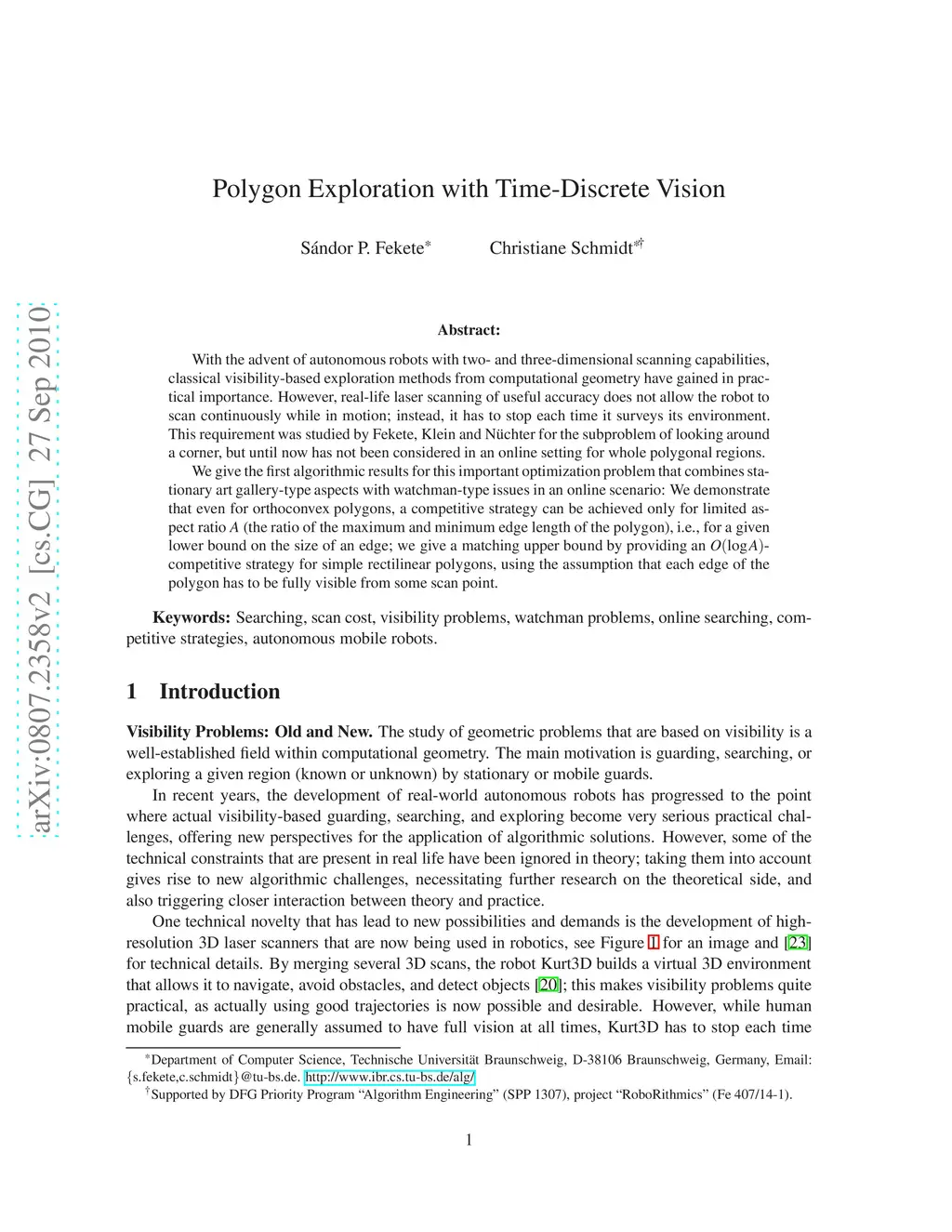 With the advent of autonomous robots with two- and three-dimensional scanning capabilities, classical visibility-based exploration methods from computational geometry have gained in practical importance. However, real-life laser scanning of useful accuracy does not allow the robot to scan continuously while in motion; instead, it has to stop each time it surveys its environment. This requirement was studied by Fekete, Klein and Nuechter for the subproblem of looking around a corner, but until now has not been considered in an online setting for whole polygonal regions. We give the first algorithmic results for this important algorithmic problem that combines stationary art gallery-type aspects with watchman-type issues in an online scenario: We demonstrate that even for orthoconvex polygons, a competitive strategy can be achieved only for limited aspect ratio A (the ratio of the maximum and minimum edge length of the polygon), i.e., for a given lower bound on the size of an edge; we give a matching upper bound by providing an O(log A)-competitive strategy for simple rectilinear polygons, using the assumption that each edge of the polygon has to be fully visible from some scan point.