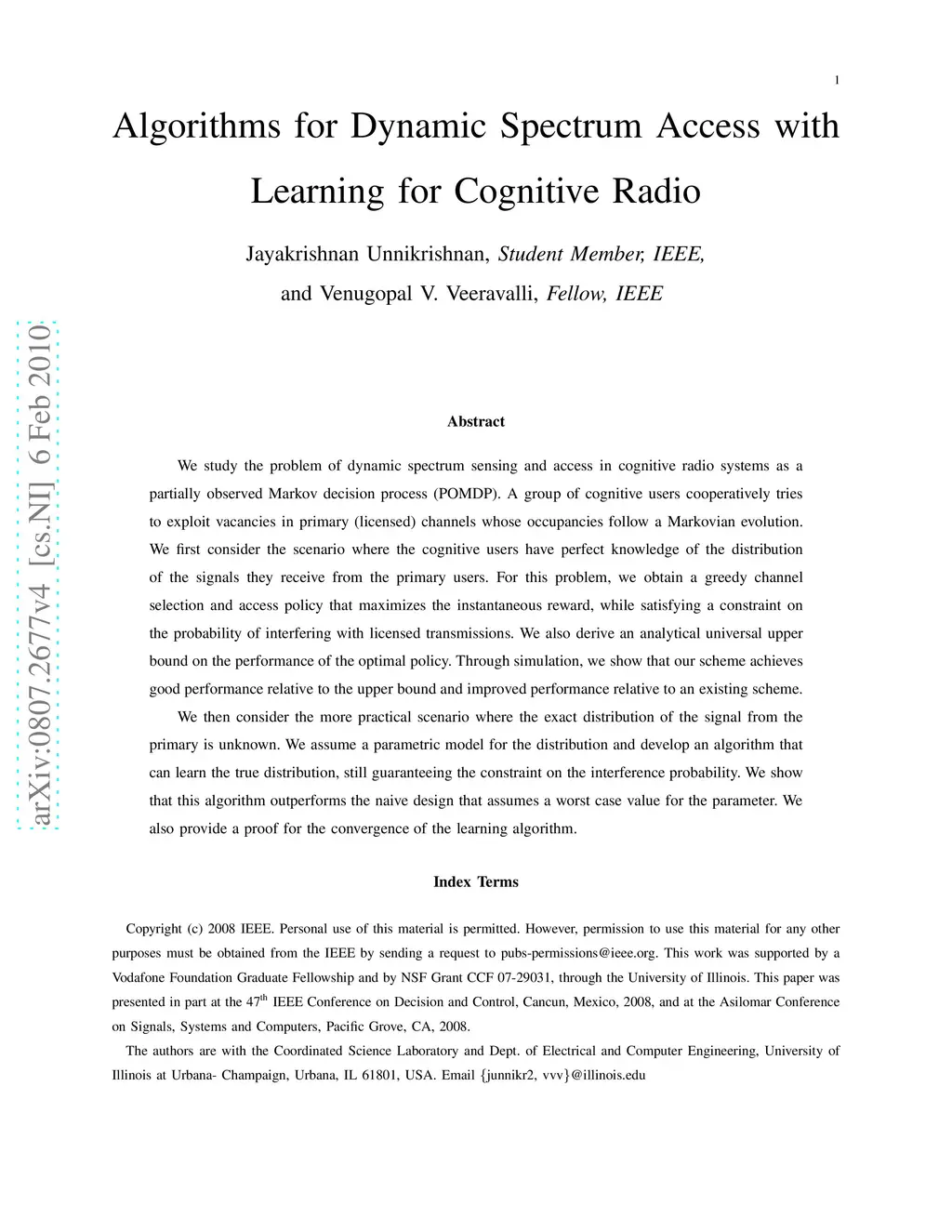 Algorithms for Dynamic Spectrum Access with Learning for Cognitive Radio