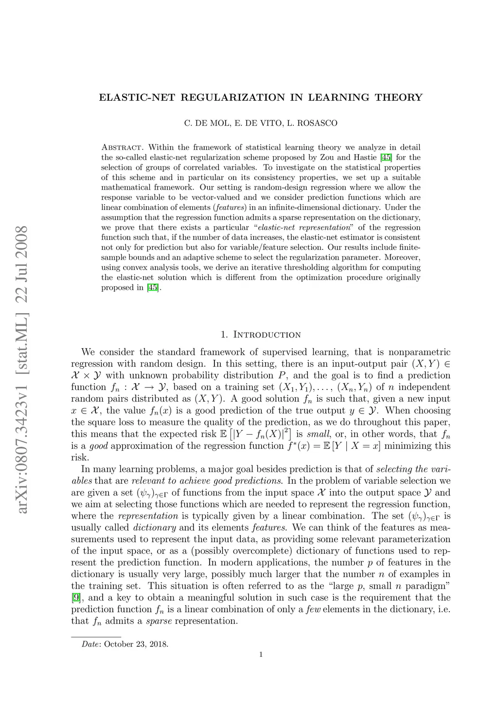 Within the framework of statistical learning theory we analyze in detail the so-called elastic-net regularization scheme proposed by Zou and Hastie for the selection of groups of correlated variables. To investigate on the statistical properties of this scheme and in particular on its consistency properties, we set up a suitable mathematical framework. Our setting is random-design regression where we allow the response variable to be vector-valued and we consider prediction functions which are linear combination of elements ({\em features}) in an infinite-dimensional dictionary. Under the assumption that the regression function admits a sparse representation on the dictionary, we prove that there exists a particular ``{\em elastic-net representation}'' of the regression function such that, if the number of data increases, the elastic-net estimator is consistent not only for prediction but also for variable/feature selection. Our results include finite-sample bounds and an adaptive scheme to select the regularization parameter. Moreover, using convex analysis tools, we derive an iterative thresholding algorithm for computing the elastic-net solution which is different from the optimization procedure originally proposed by Zou and Hastie