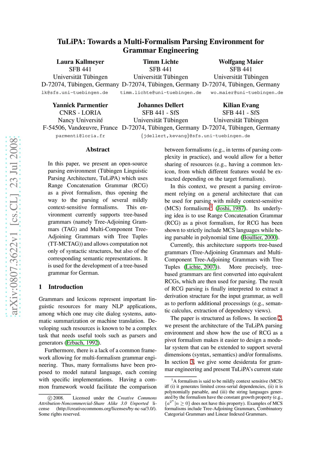 In this paper, we present an open-source parsing environment (Tuebingen Linguistic Parsing Architecture, TuLiPA) which uses Range Concatenation Grammar (RCG) as a pivot formalism, thus opening the way to the parsing of several mildly context-sensitive formalisms. This environment currently supports tree-based grammars (namely Tree-Adjoining Grammars, TAG) and Multi-Component Tree-Adjoining Grammars with Tree Tuples (TT-MCTAG)) and allows computation not only of syntactic structures, but also of the corresponding semantic representations. It is used for the development of a tree-based grammar for German.