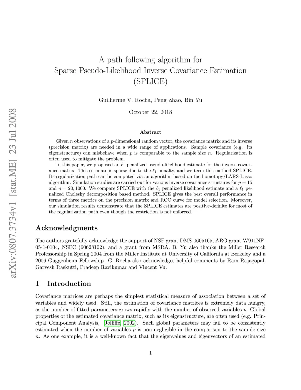 Given n observations of a p-dimensional random vector, the covariance matrix and its inverse (precision matrix) are needed in a wide range of applications. Sample covariance (e.g. its eigenstructure) can misbehave when p is comparable to the sample size n. Regularization is often used to mitigate the problem. In this paper, we proposed an l1-norm penalized pseudo-likelihood estimate for the inverse covariance matrix. This estimate is sparse due to the l1-norm penalty, and we term this method SPLICE. Its regularization path can be computed via an algorithm based on the homotopy/LARS-Lasso algorithm. Simulation studies are carried out for various inverse covariance structures for p=15 and n=20, 1000. We compare SPLICE with the l1-norm penalized likelihood estimate and a l1-norm penalized Cholesky decomposition based method. SPLICE gives the best overall performance in terms of three metrics on the precision matrix and ROC curve for model selection. Moreover, our simulation results demonstrate that the SPLICE estimates are positive-definite for most of the regularization path even though the restriction is not enforced.