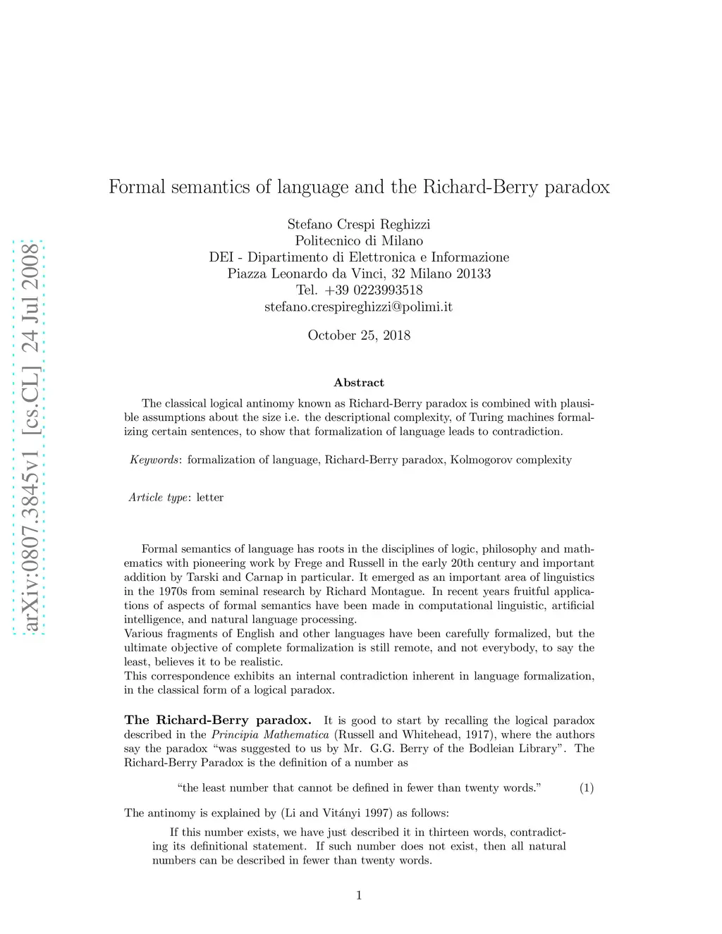 The classical logical antinomy known as Richard-Berry paradox is combined with plausible assumptions about the size i.e. the descriptional complexity of Turing machines formalizing certain sentences, to show that formalization of language leads to contradiction.