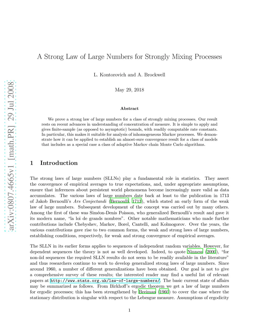 We prove a strong law of large numbers for a class of strongly mixing processes. Our result rests on recent advances in understanding of concentration of measure. It is simple to apply and gives finite-sample (as opposed to asymptotic) bounds, with readily computable rate constants. In particular, this makes it suitable for analysis of inhomogeneous Markov processes. We demonstrate how it can be applied to establish an almost-sure convergence result for a class of models that includes as a special case a class of adaptive Markov chain Monte Carlo algorithms.