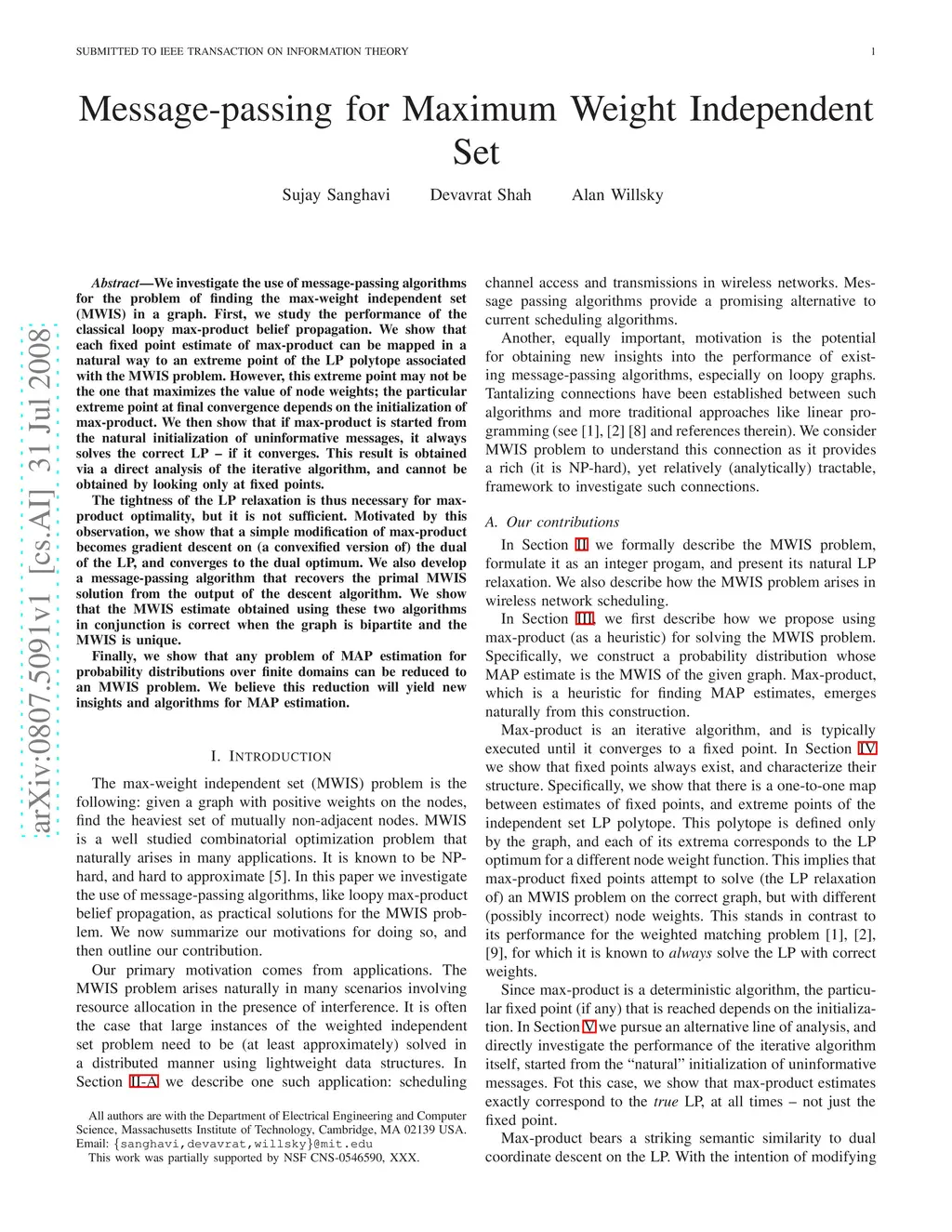 We investigate the use of message-passing algorithms for the problem of finding the max-weight independent set (MWIS) in a graph. First, we study the performance of the classical loopy max-product belief propagation. We show that each fixed point estimate of max-product can be mapped in a natural way to an extreme point of the LP polytope associated with the MWIS problem. However, this extreme point may not be the one that maximizes the value of node weights; the particular extreme point at final convergence depends on the initialization of max-product. We then show that if max-product is started from the natural initialization of uninformative messages, it always solves the correct LP -- if it converges. This result is obtained via a direct analysis of the iterative algorithm, and cannot be obtained by looking only at fixed points. The tightness of the LP relaxation is thus necessary for max-product optimality, but it is not sufficient. Motivated by this observation, we show that a simple modification of max-product becomes gradient descent on (a convexified version of) the dual of the LP, and converges to the dual optimum. We also develop a message-passing algorithm that recovers the primal MWIS solution from the output of the descent algorithm. We show that the MWIS estimate obtained using these two algorithms in conjunction is correct when the graph is bipartite and the MWIS is unique. Finally, we show that any problem of MAP estimation for probability distributions over finite domains can be reduced to an MWIS problem. We believe this reduction will yield new insights and algorithms for MAP estimation.