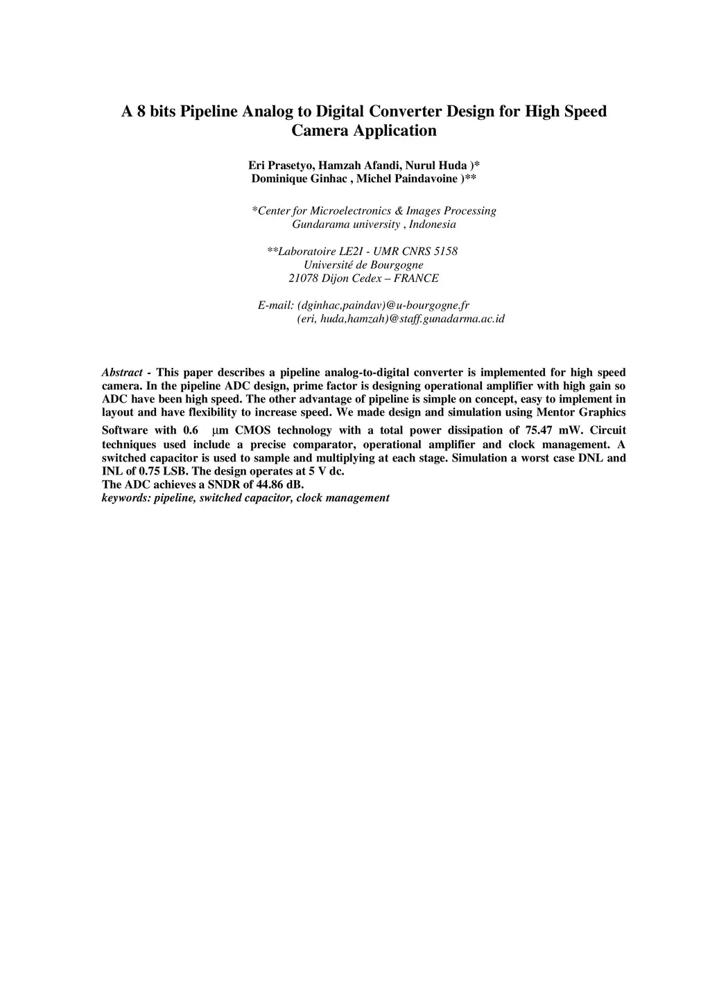 - This paper describes a pipeline analog-to-digital converter is implemented for high speed camera. In the pipeline ADC design, prime factor is designing operational amplifier with high gain so ADC have been high speed. The other advantage of pipeline is simple on concept, easy to implement in layout and have flexibility to increase speed. We made design and simulation using Mentor Graphics Software with 0.6 \mu m CMOS technology with a total power dissipation of 75.47 mW. Circuit techniques used include a precise comparator, operational amplifier and clock management. A switched capacitor is used to sample and multiplying at each stage. Simulation a worst case DNL and INL of 0.75 LSB. The design operates at 5 V dc. The ADC achieves a SNDR of 44.86 dB. keywords: pipeline, switched capacitor, clock management
