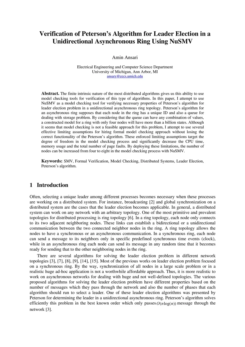 The finite intrinsic nature of the most distributed algorithms gives us this ability to use model checking tools for verification of this type of algorithms. In this paper, I attempt to use NuSMV as a model checking tool for verifying necessary properties of Peterson's algorithm for leader election problem in a unidirectional asynchronous ring topology. Peterson's algorithm for an asynchronous ring supposes that each node in the ring has a unique ID and also a queue for dealing with storage problem. By considering that the queue can have any combination of values, a constructed model for a ring with only four nodes will have more than a billion states. Although it seems that model checking is not a feasible approach for this problem, I attempt to use several effective limiting assumptions for hiring formal model checking approach without losing the correct functionality of the Peterson's algorithm. These enforced limiting assumptions target the degree of freedom in the model checking process and significantly decrease the CPU time, memory usage and the total number of page faults. By deploying these limitations, the number of nodes can be increased from four to eight in the model checking process with NuSMV.