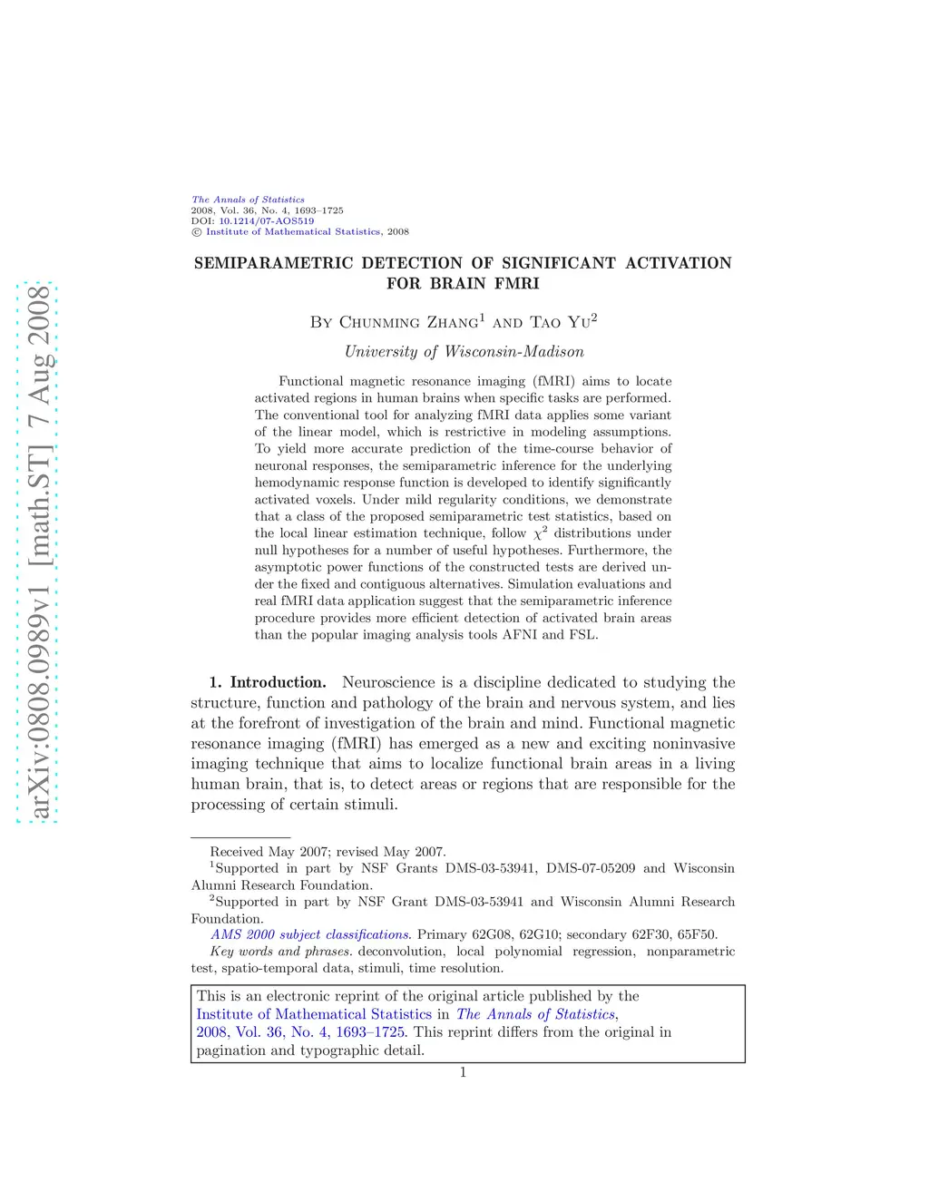 Functional magnetic resonance imaging (fMRI) aims to locate activated regions in human brains when specific tasks are performed. The conventional tool for analyzing fMRI data applies some variant of the linear model, which is restrictive in modeling assumptions. To yield more accurate prediction of the time-course behavior of neuronal responses, the semiparametric inference for the underlying hemodynamic response function is developed to identify significantly activated voxels. Under mild regularity conditions, we demonstrate that a class of the proposed semiparametric test statistics, based on the local linear estimation technique, follow distributions under null hypotheses for a number of useful hypotheses. Furthermore, the asymptotic power functions of the constructed tests are derived under the fixed and contiguous alternatives. Simulation evaluations and real fMRI data application suggest that the semiparametric inference procedure provides more efficient detection of activated brain areas than the popular imaging analysis tools AFNI and FSL.